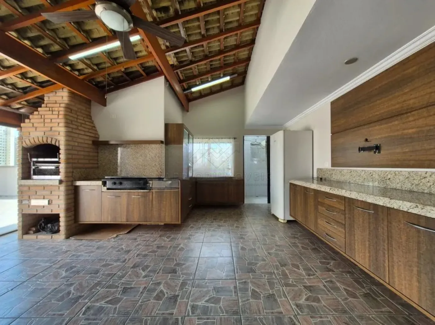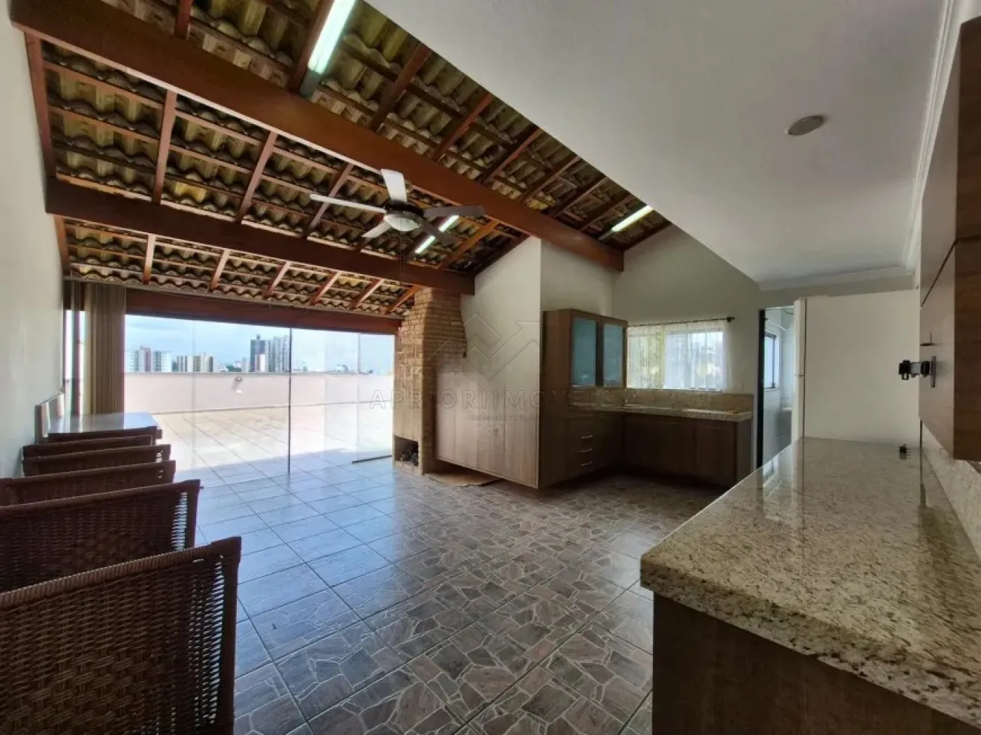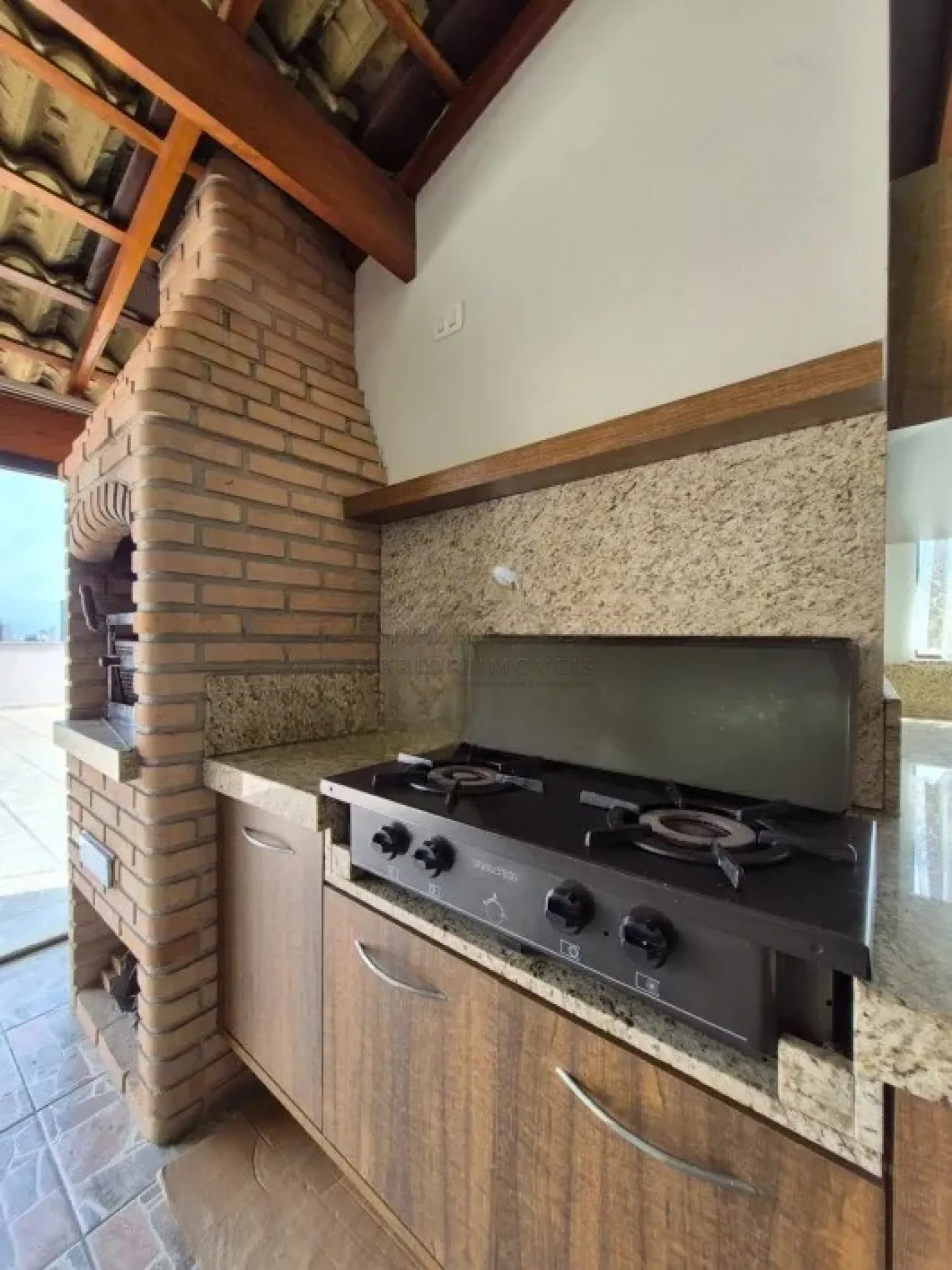 Cobertura com acesso interno, churrasqueira e banheiro;