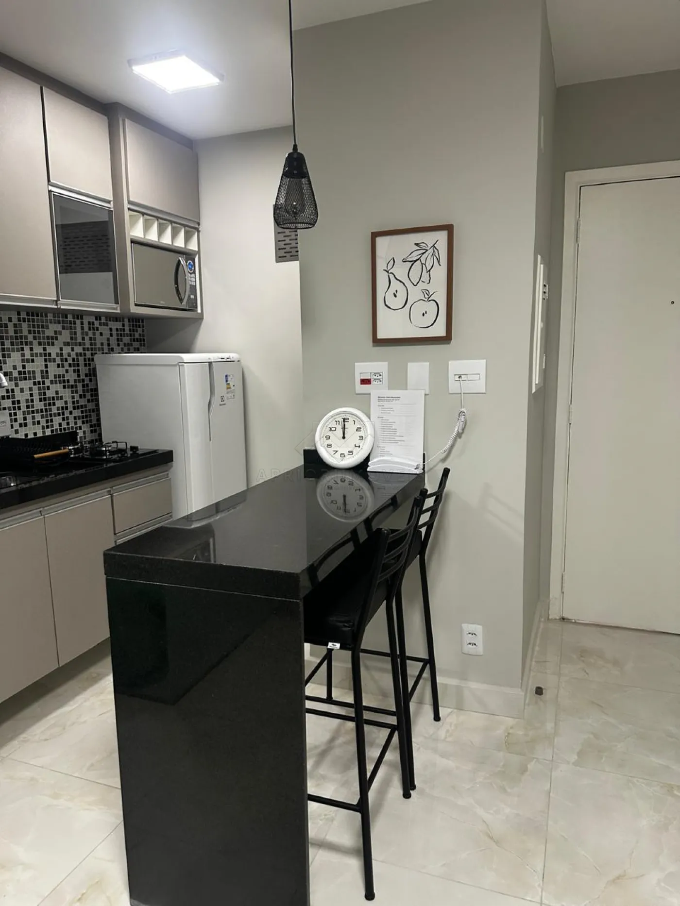 Cozinha equipada com armários planejados, geladeira, cooktop, micro-ondas e balcão de mármore com banquetas.