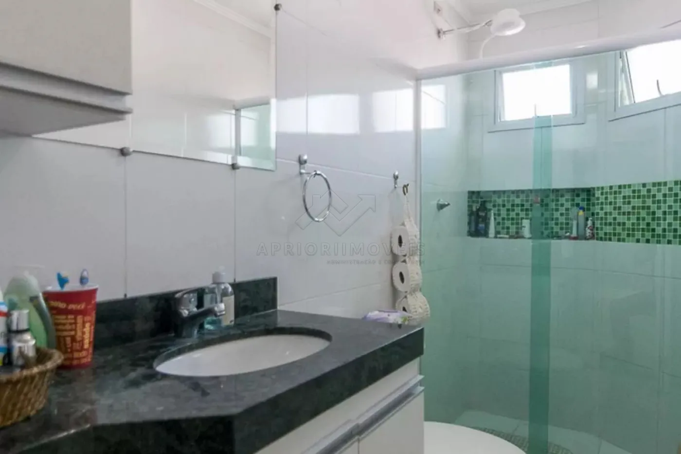 Banheiros com armários e box instalados;