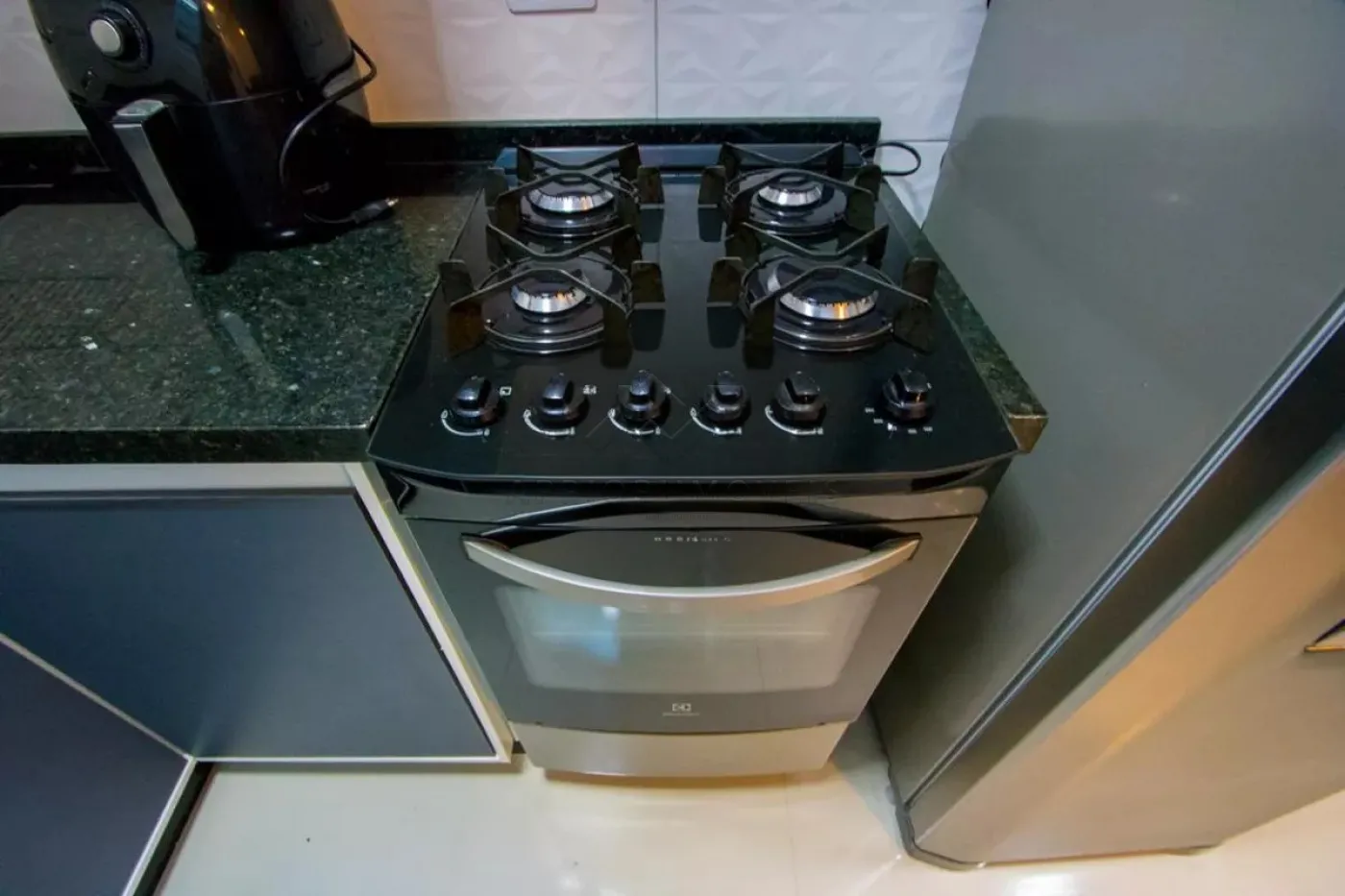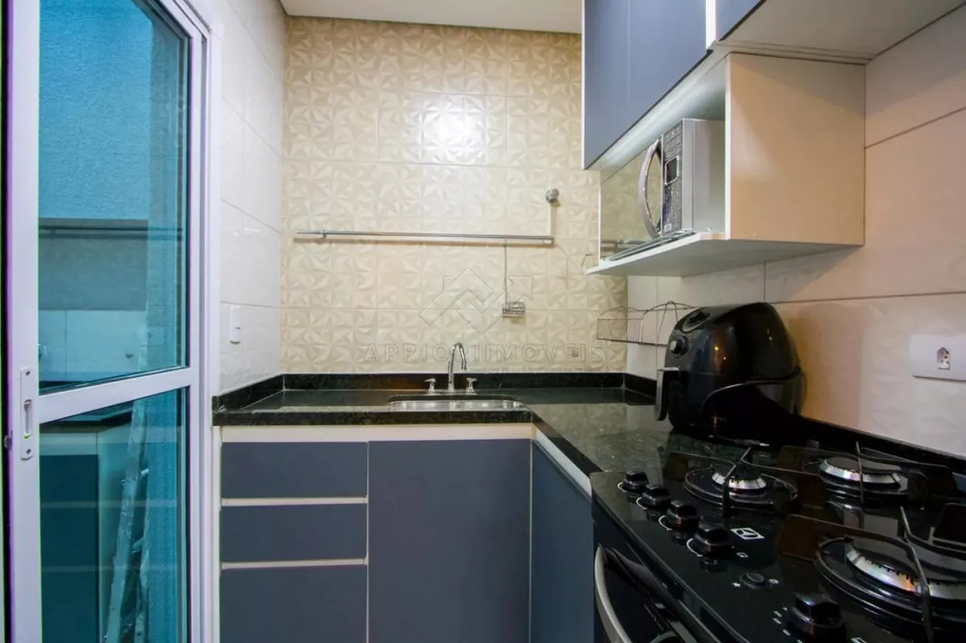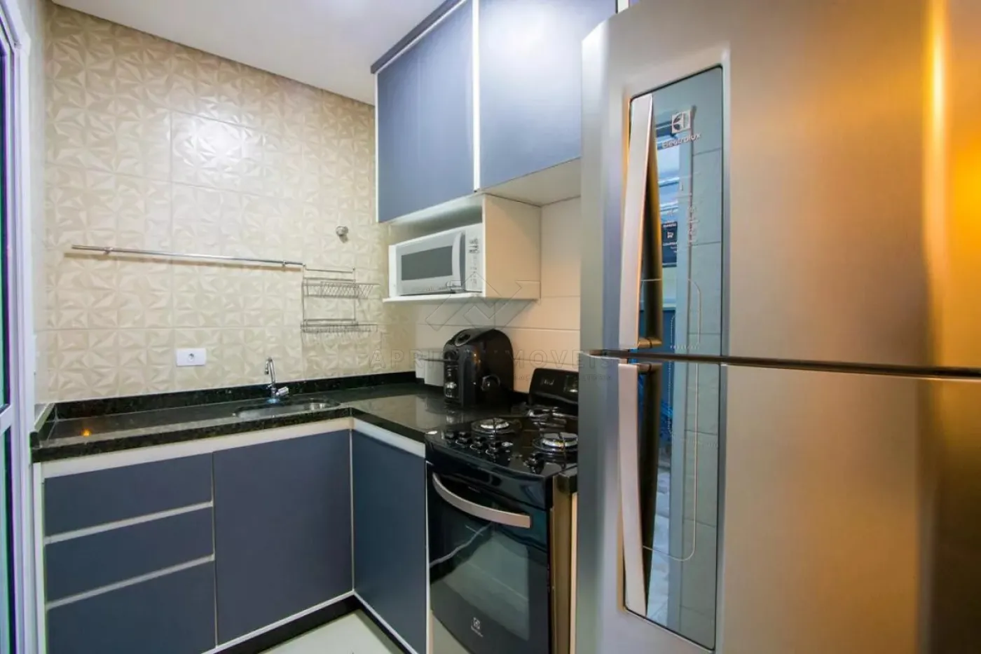 Cozinha com planejados, fogão e microondas