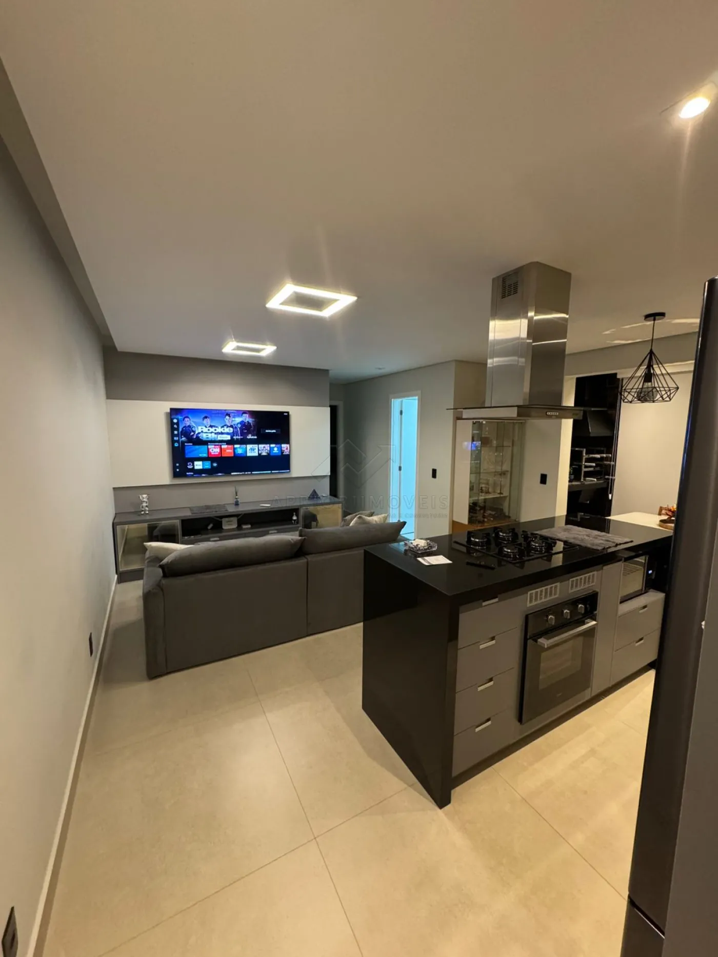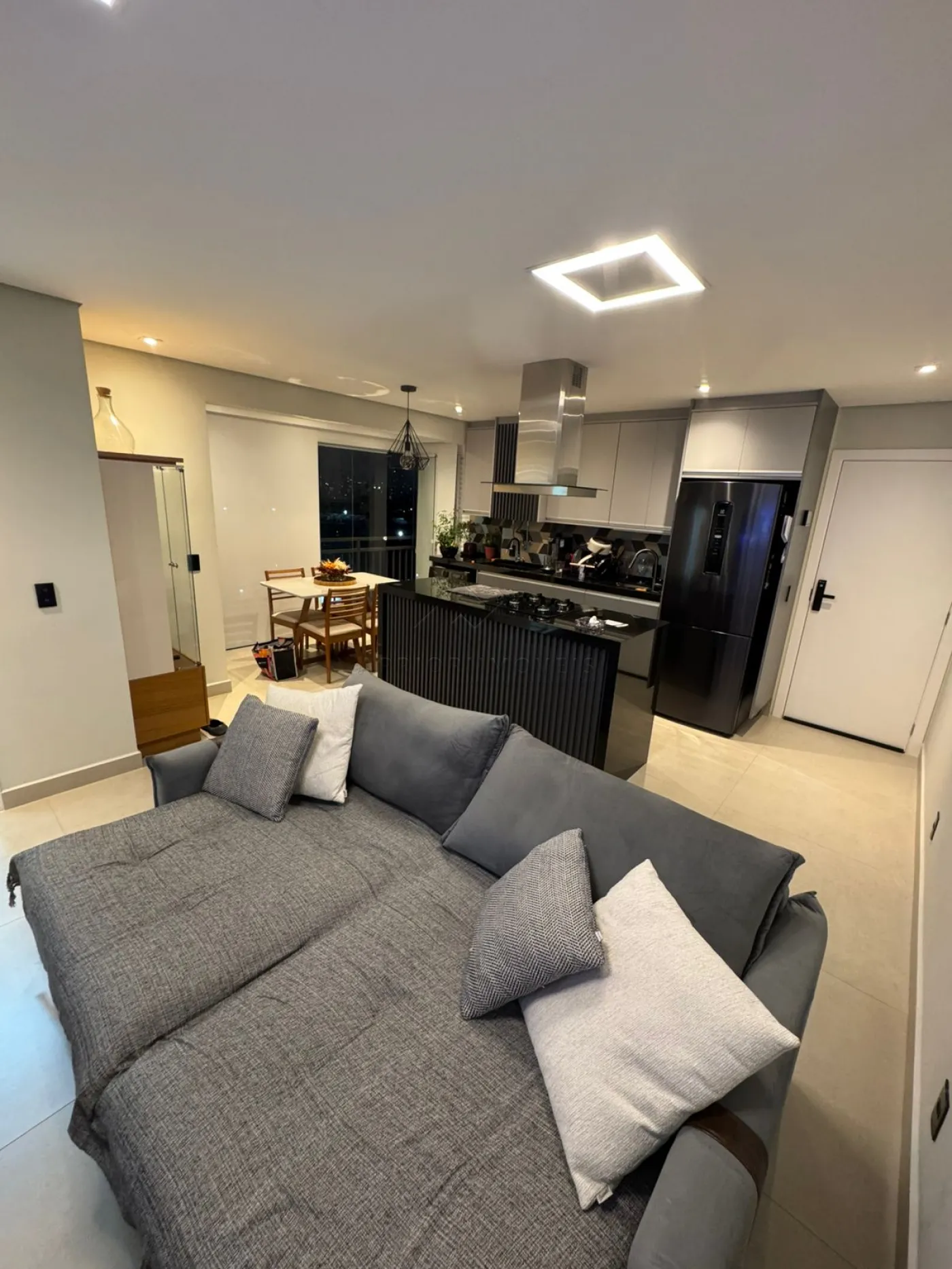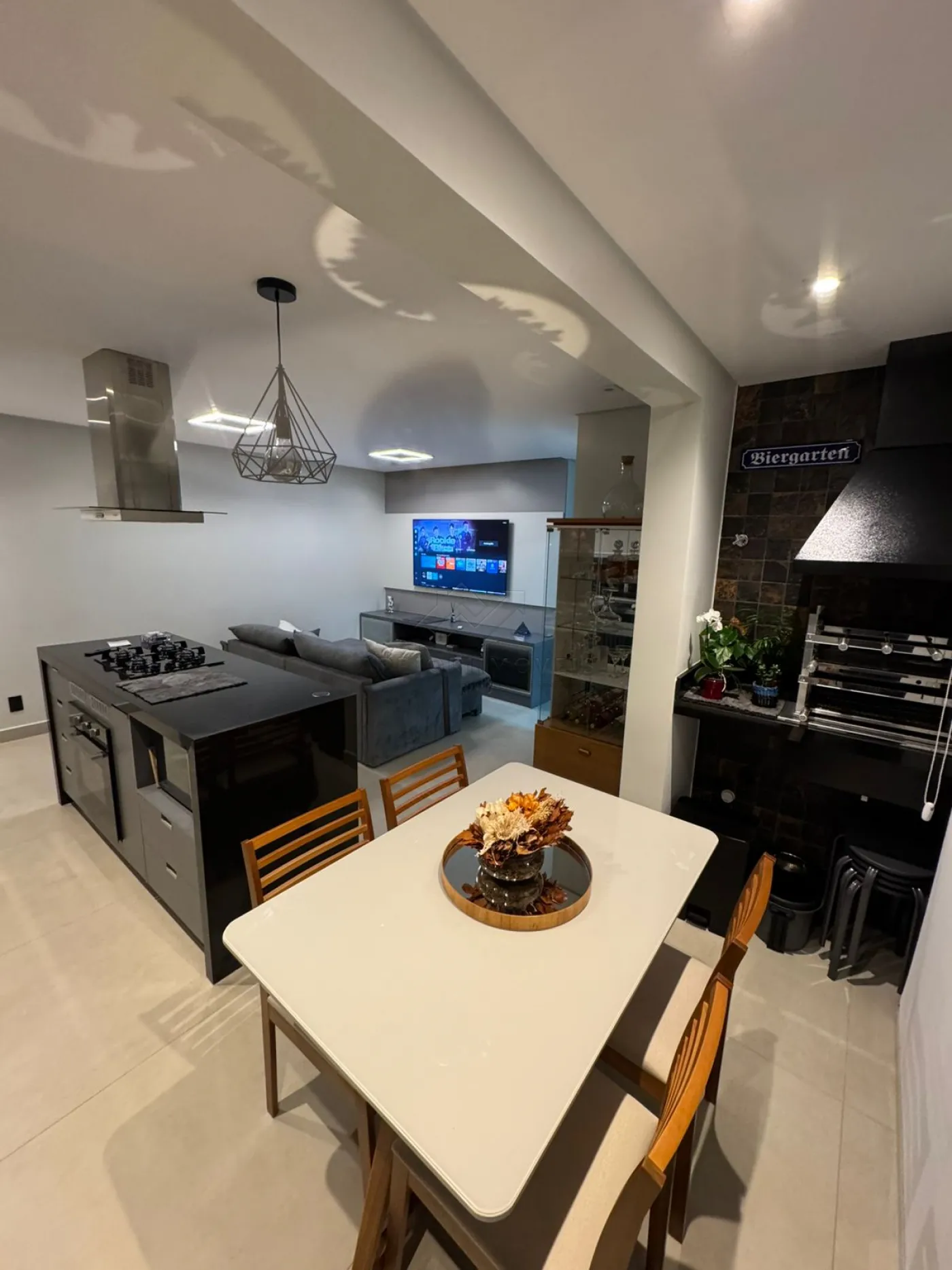 Varanda gourmet integrada à cozinha, sala e sala de jantar;