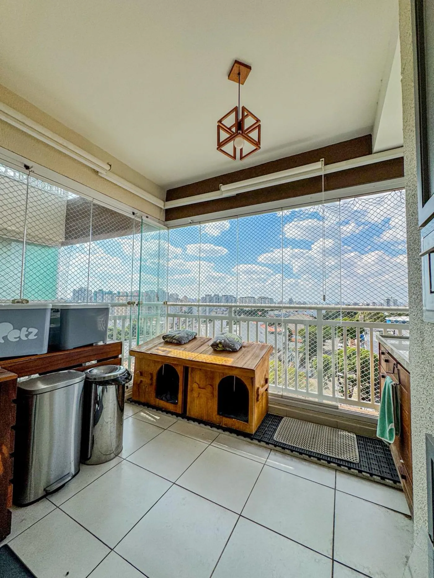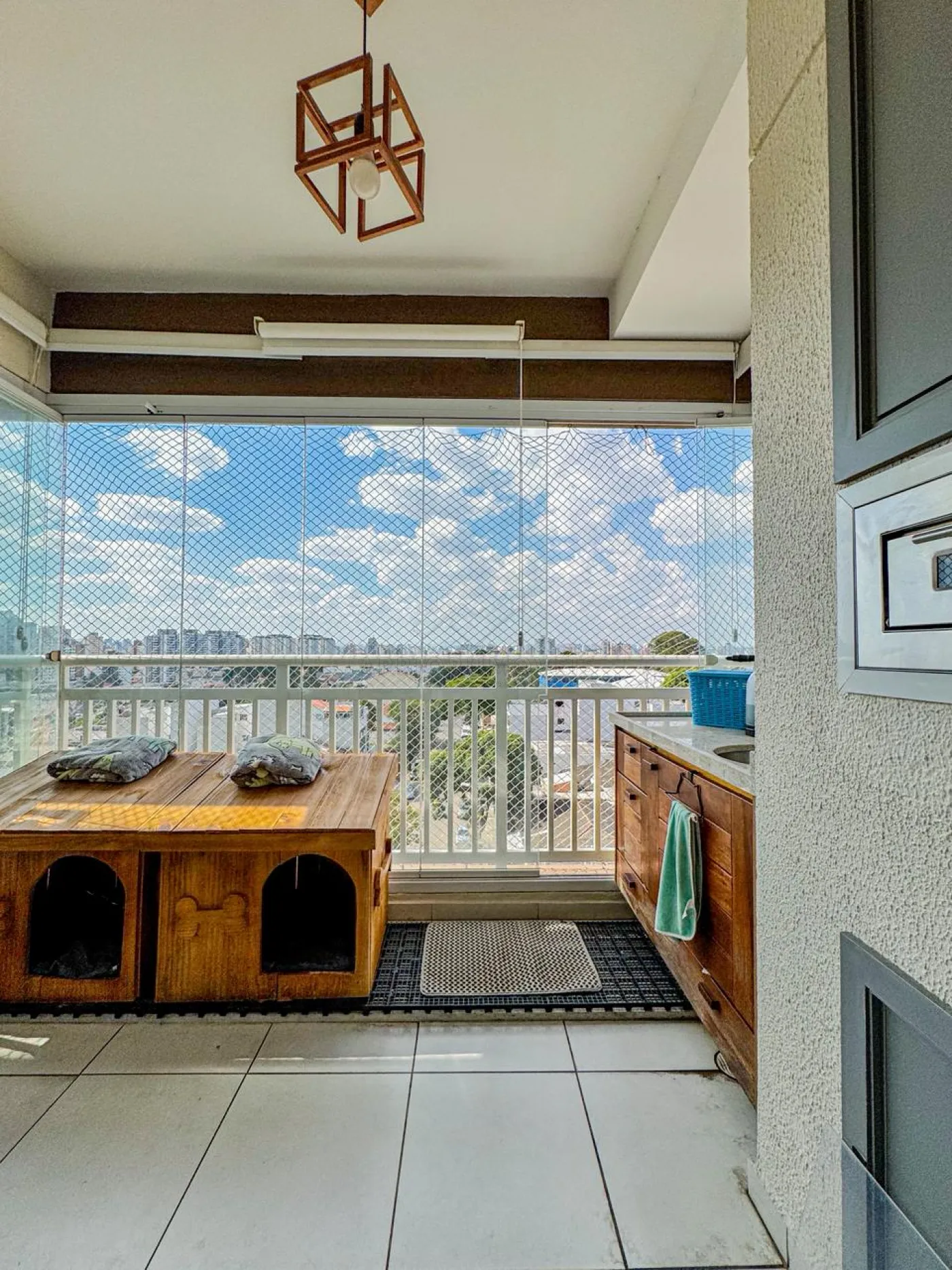 Varanda Gourmet, envidraçada com tela de proteção;