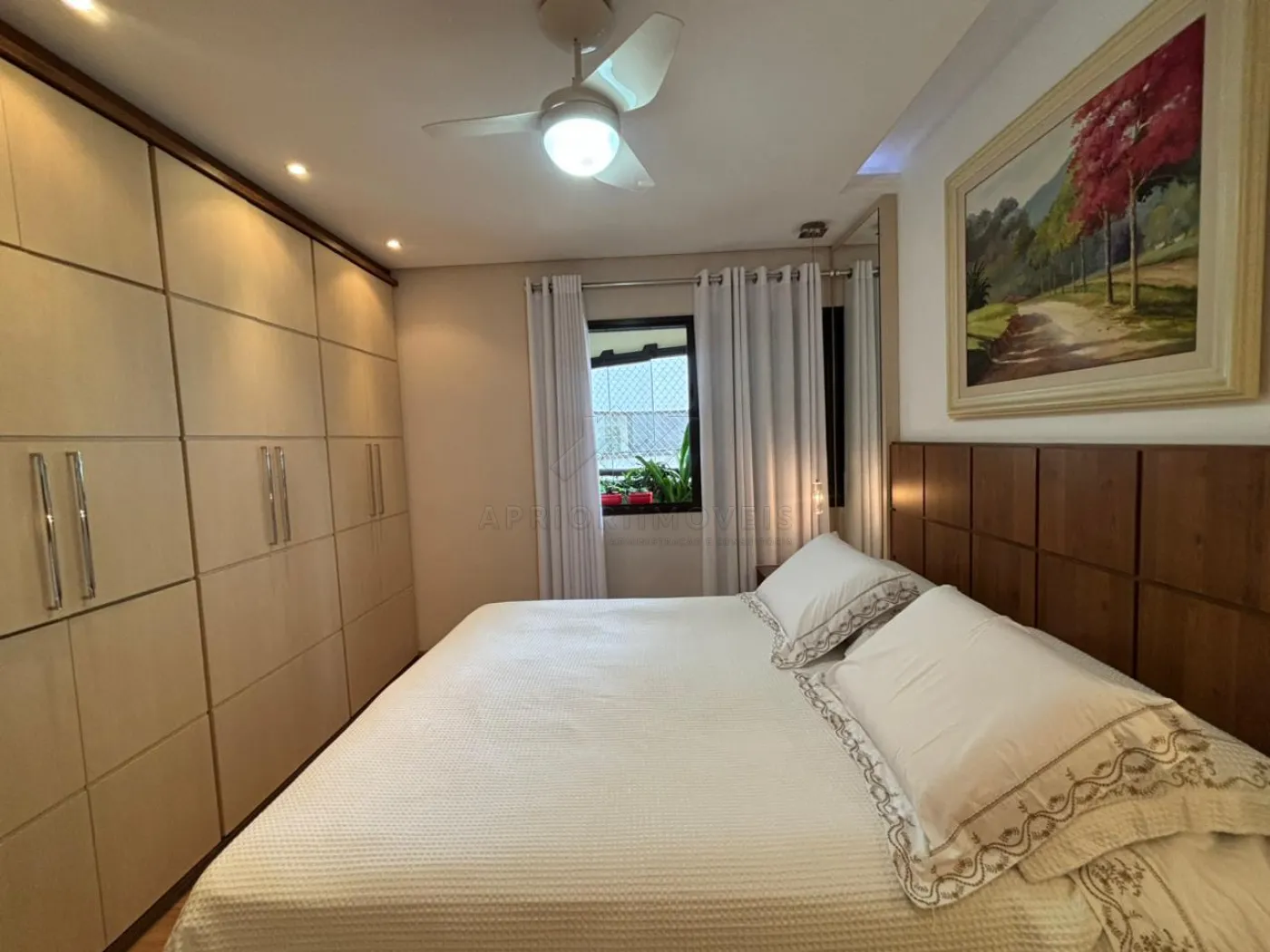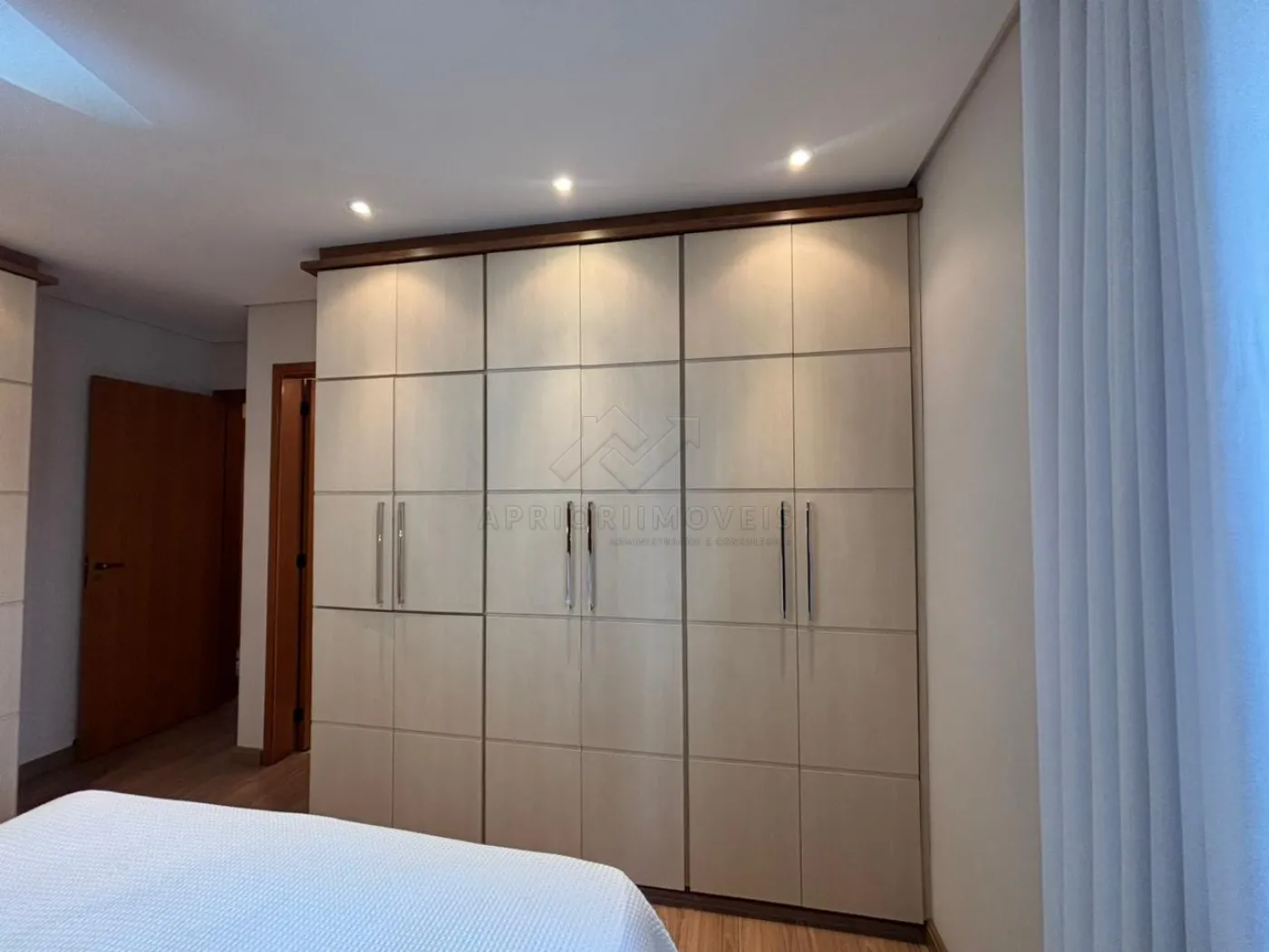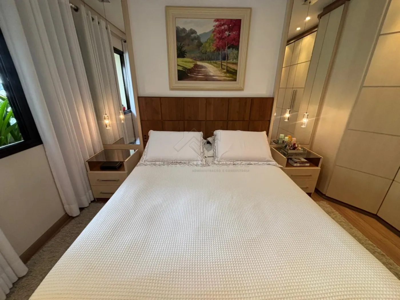 Suíte 1 (Casal): cama Queen, 2 mesinhas de cabeceira, 2 armários embutidos (com maleiros, 6 e 5 portas).
