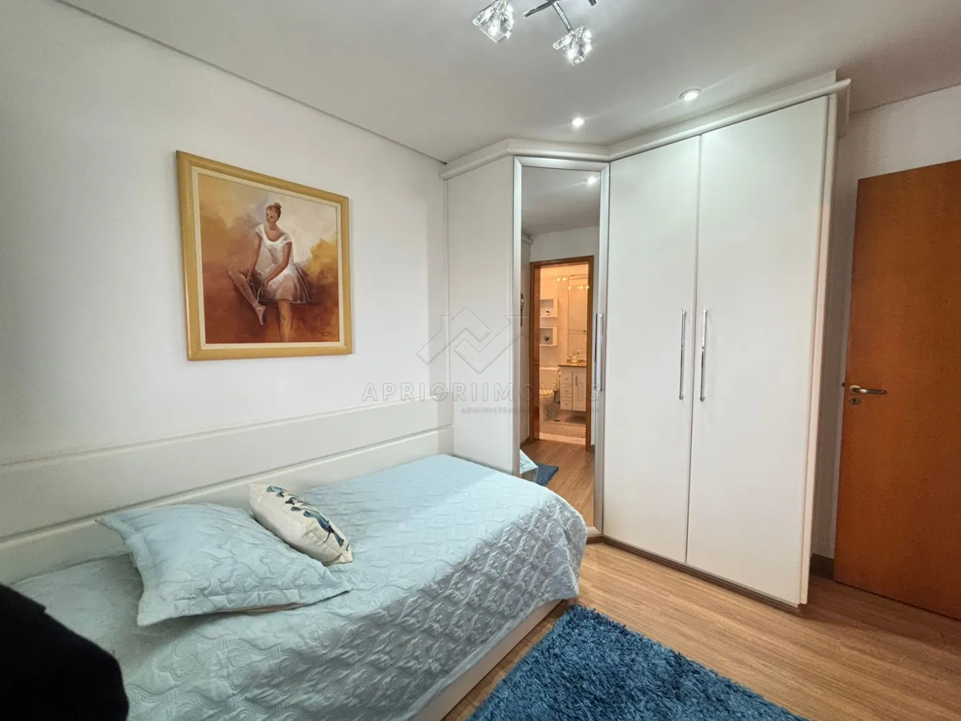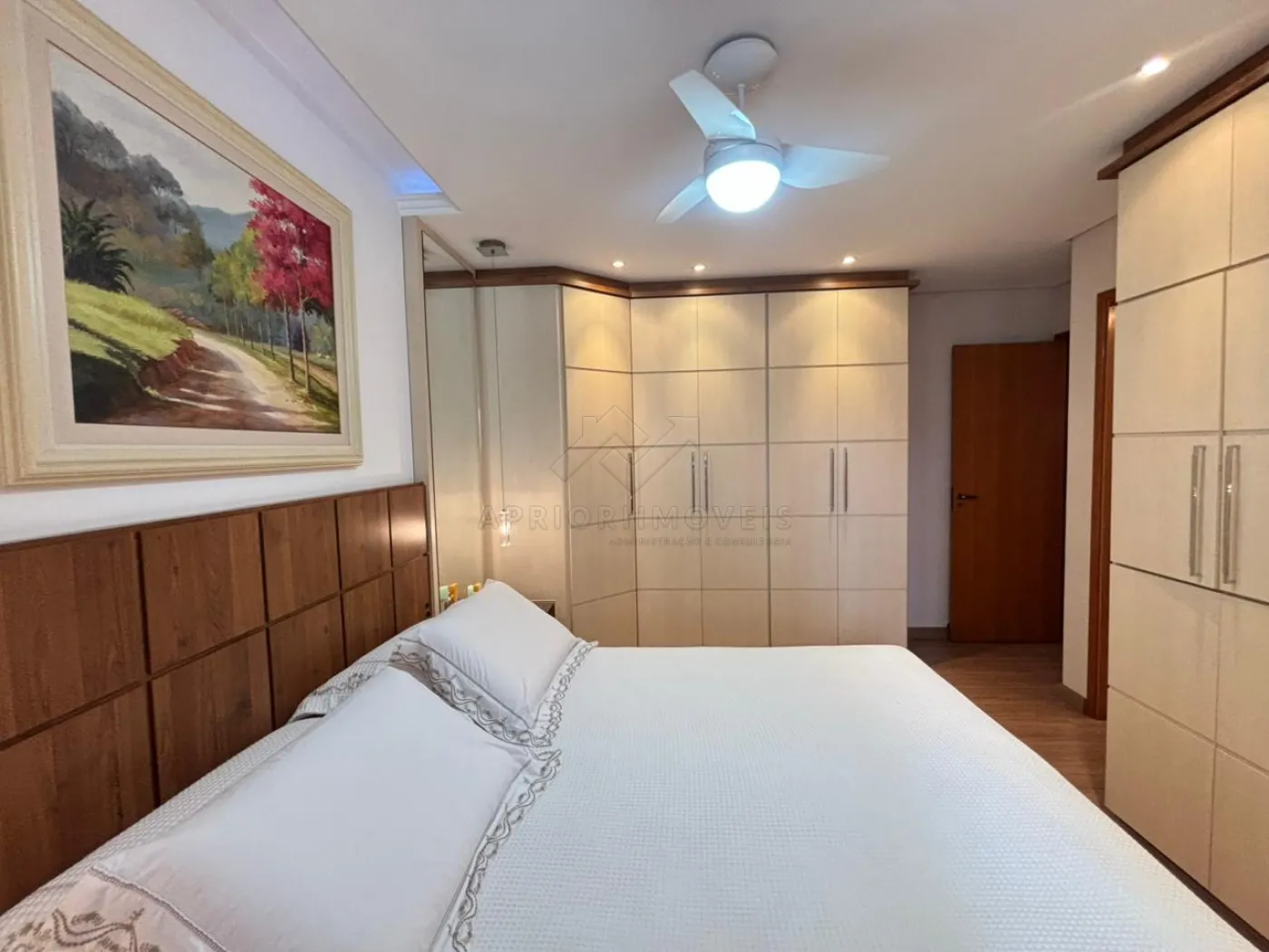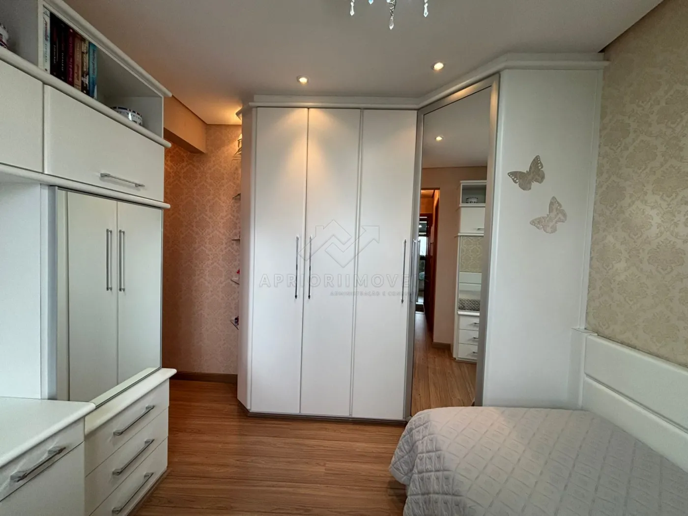 Suíte 1 (Casal): cama Queen, 2 mesinhas de cabeceira, 2 armários embutidos (com maleiros, 6 e 5 portas).