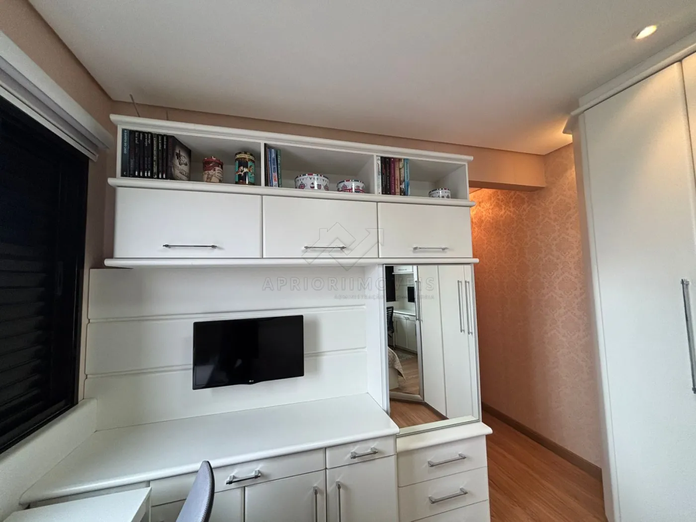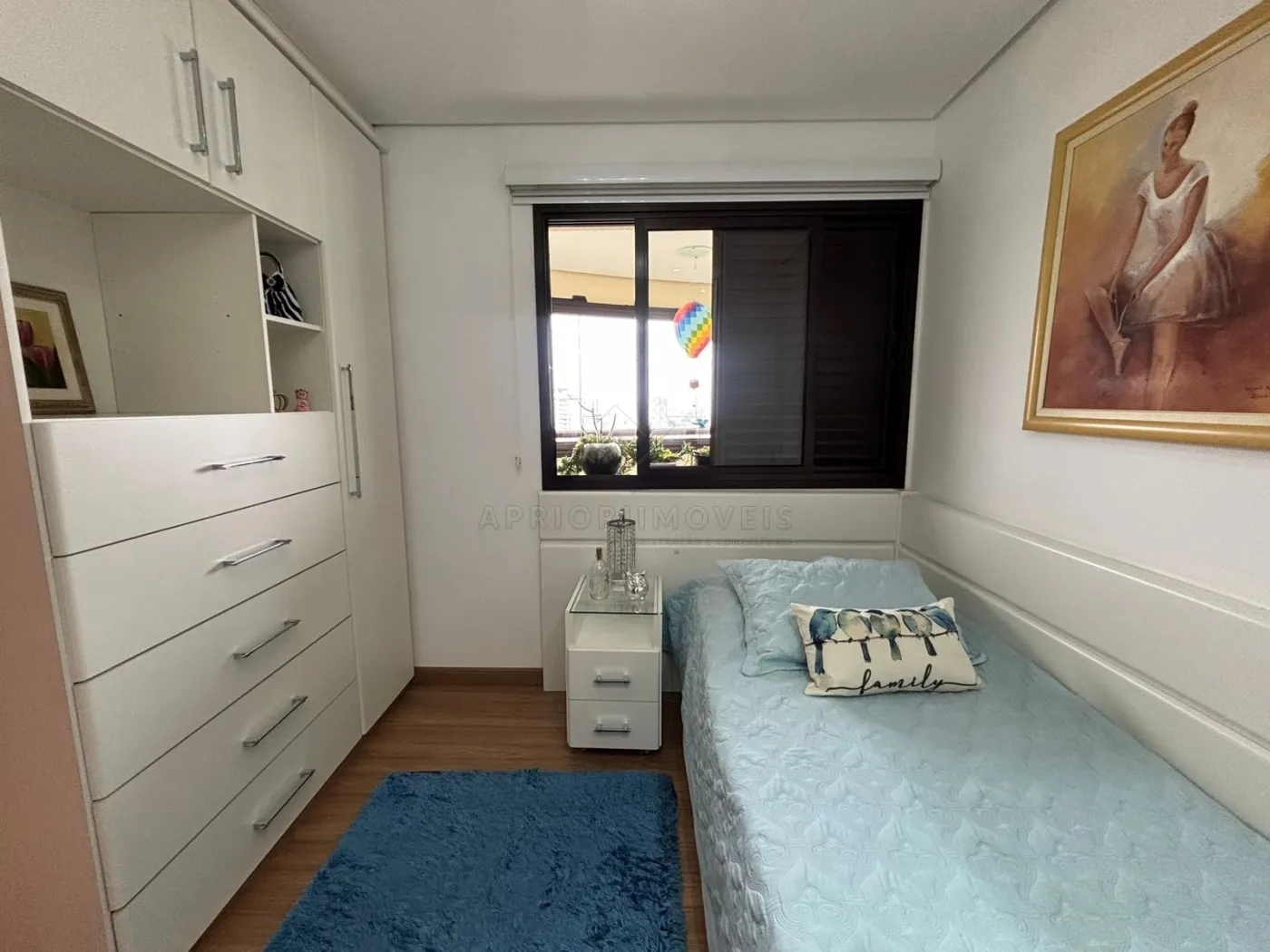 Suíte 3: cama de solteiro tipo bicama, 1 mesinha de cabeceira, 2 armários embutidos (3 portas + 1 porta + 2 maleiros + 5 gavetões).