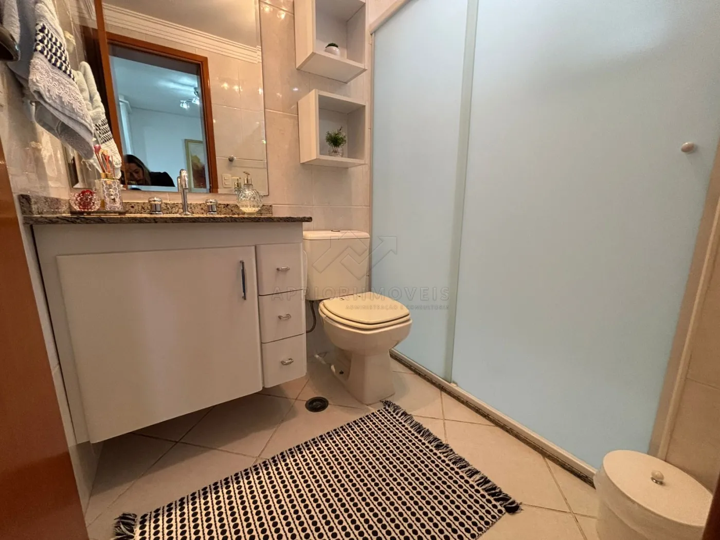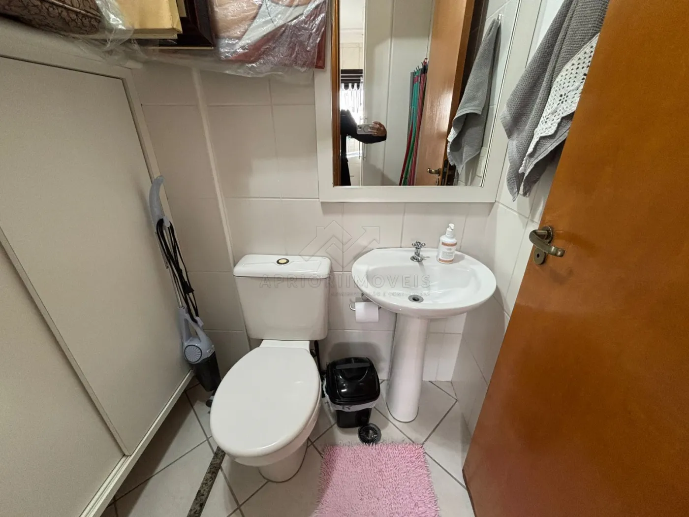 Banheiro de serviço com armário planejado.