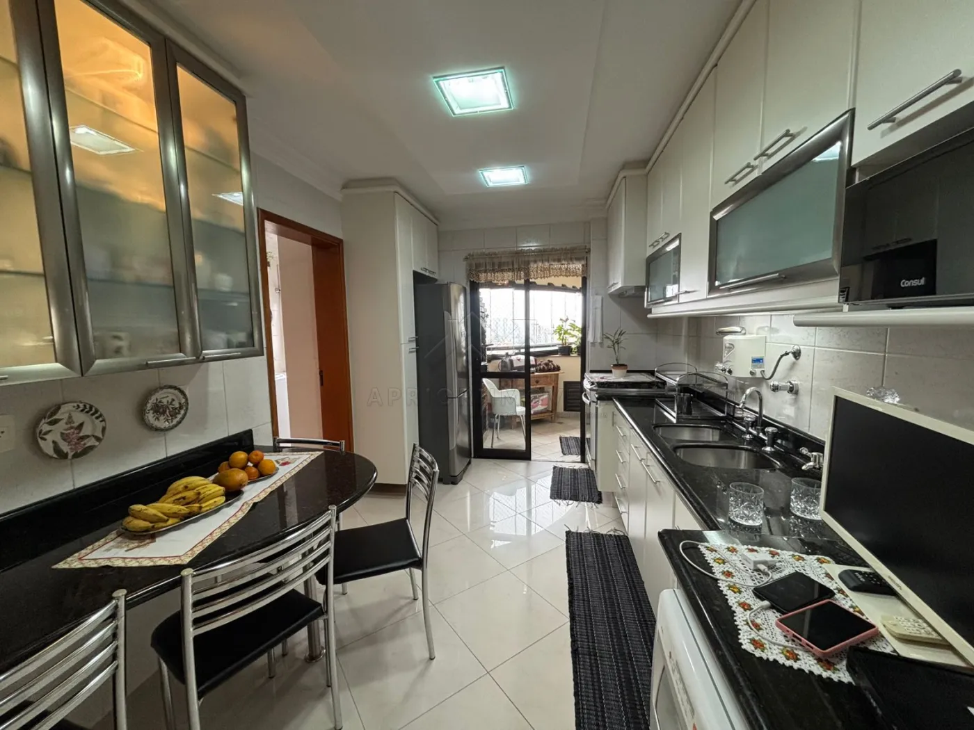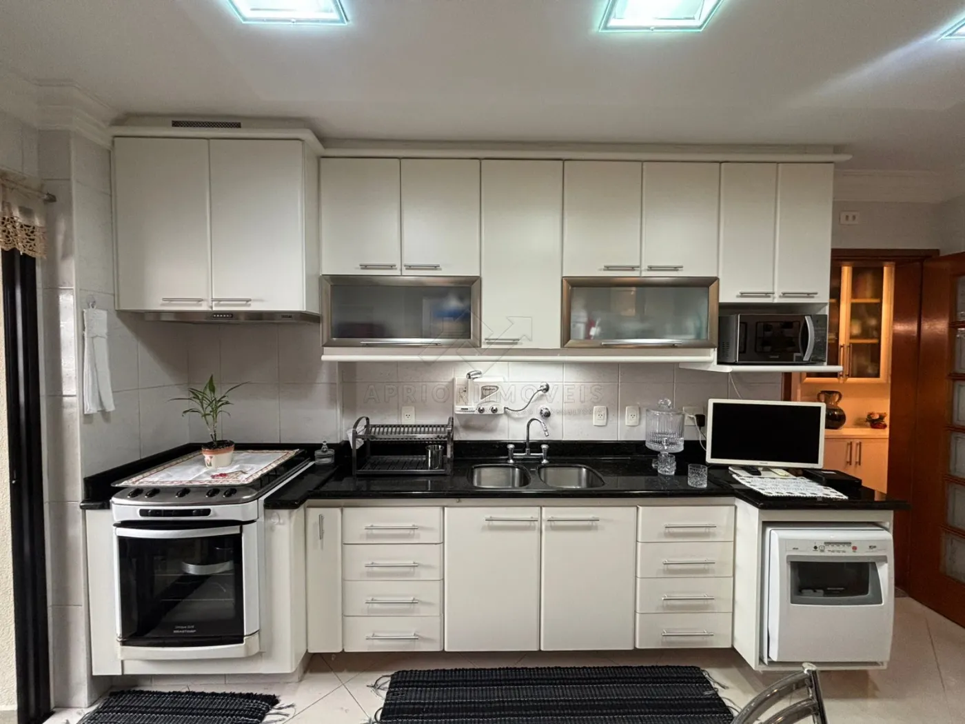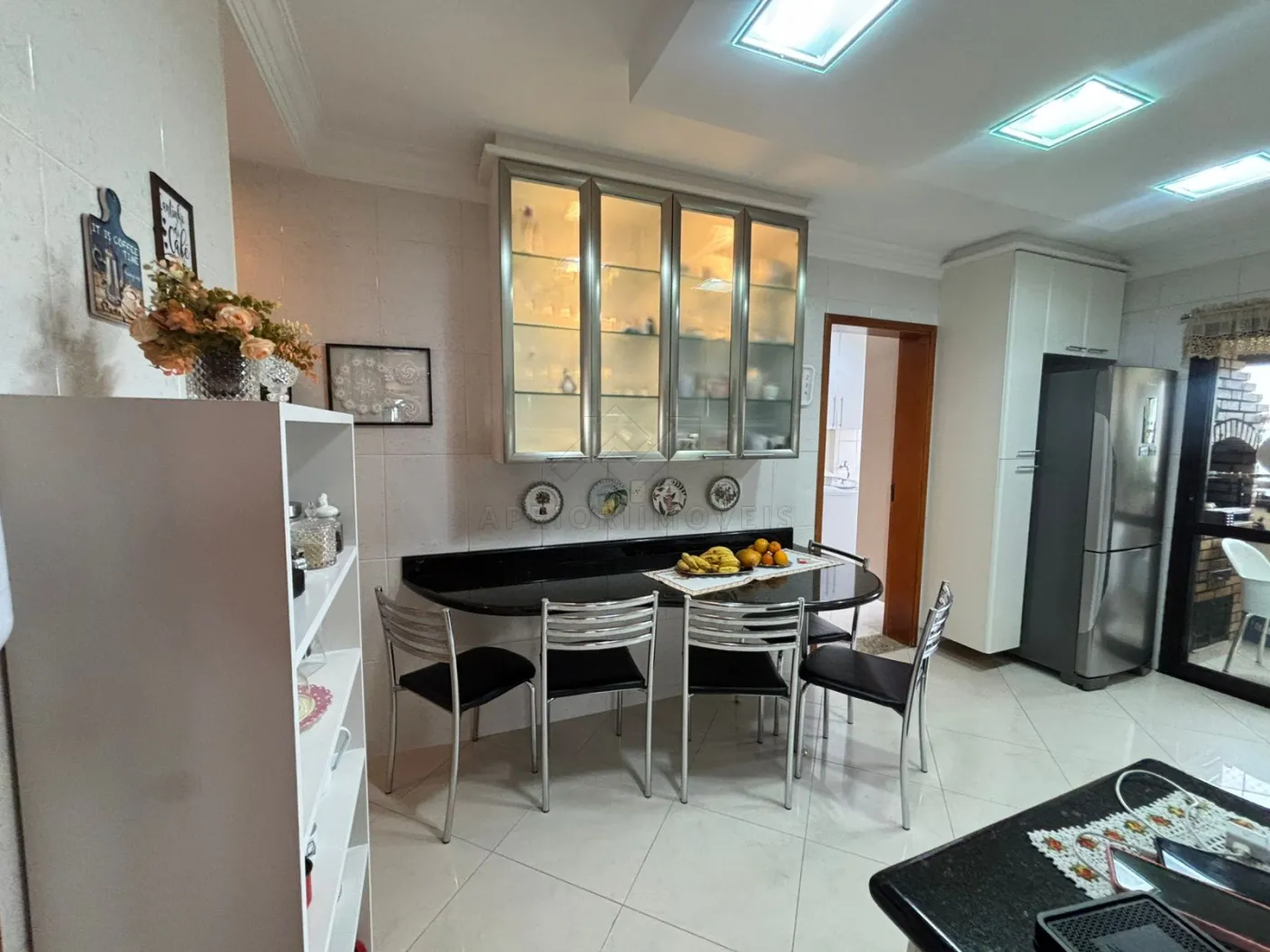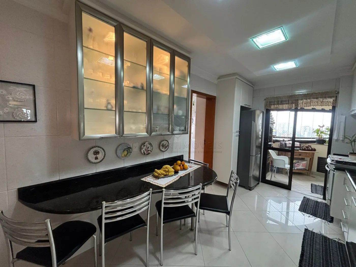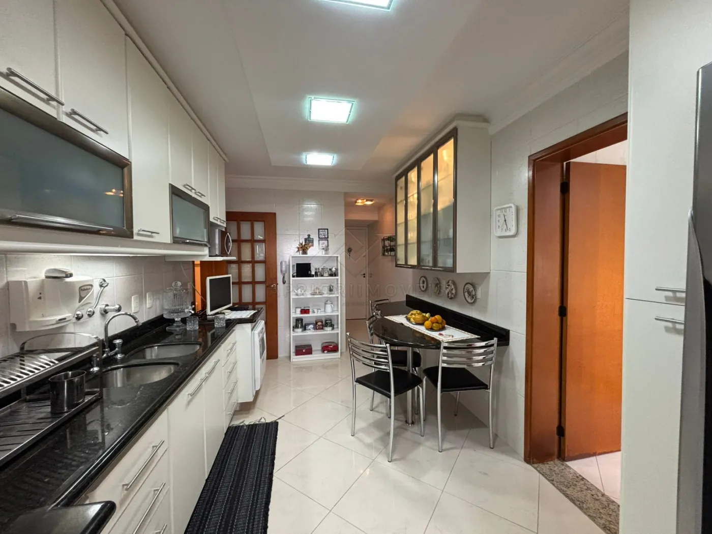 Cozinha equipada com pia e gabinete, torneira com água quente, triturador de alimentos, armários suspensos, cristaleira, mesa em granito com 5 cadeiras, lava-louças e fogão de embutir.