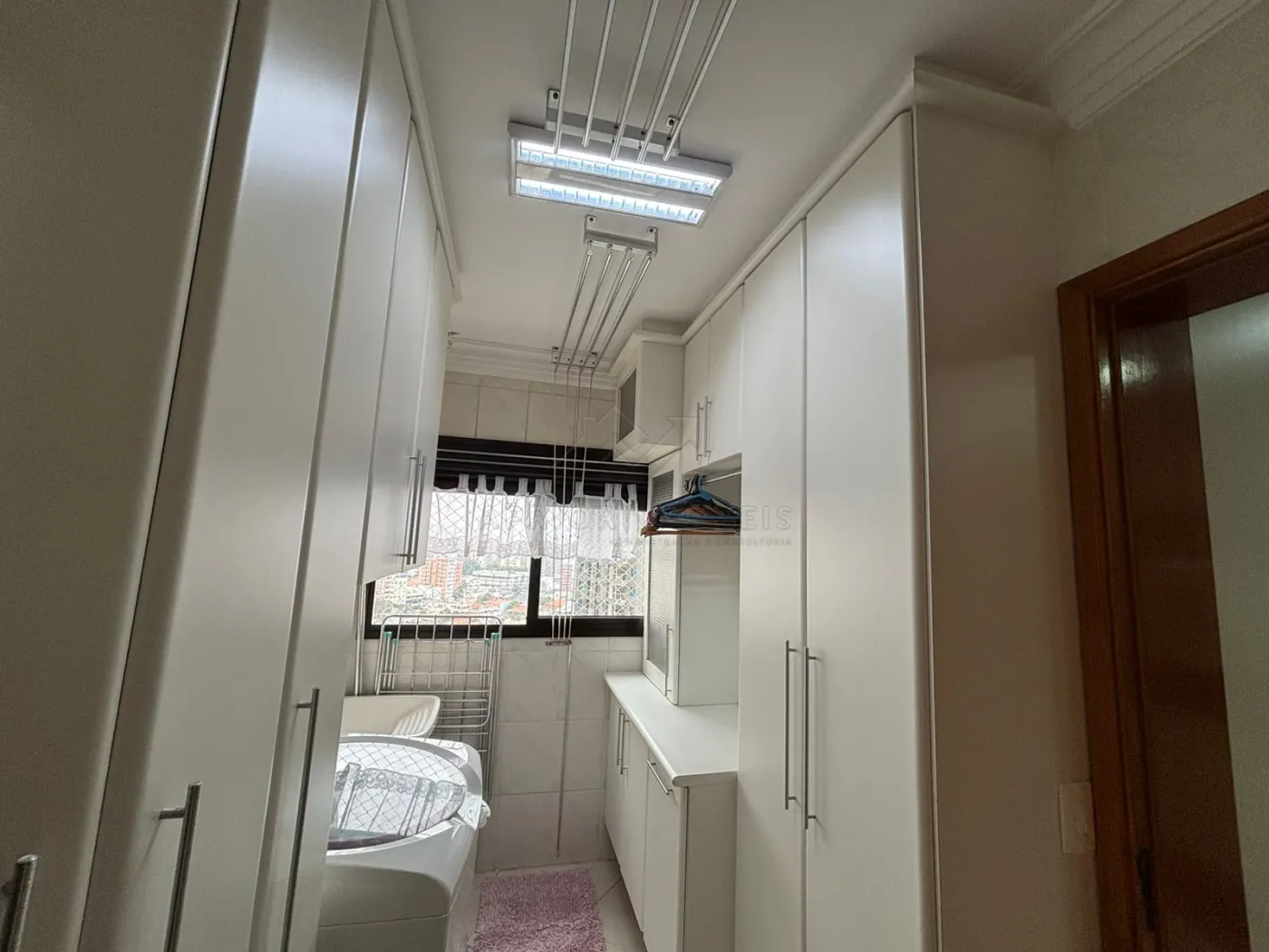 Área de serviço com armários embutidos nos dois lados e aquecedor a gás.