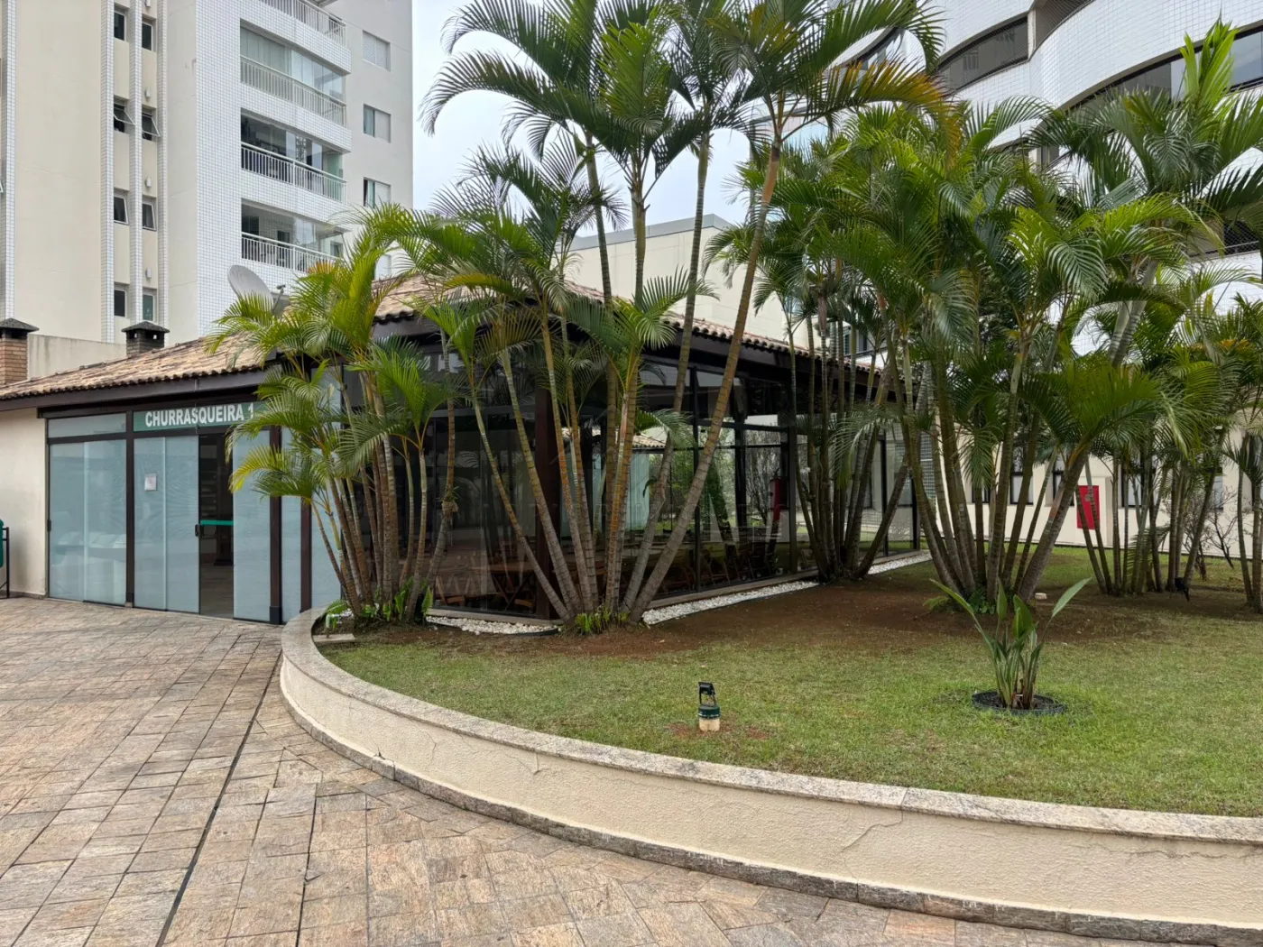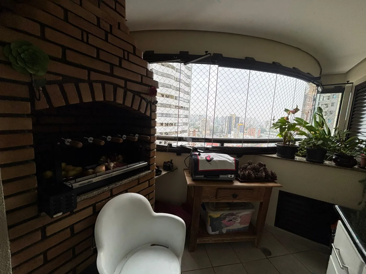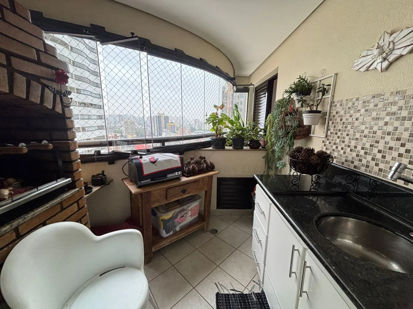 Sacada gourmet fechada com vidro, pia com gabinete e churrasqueira de alvenaria.