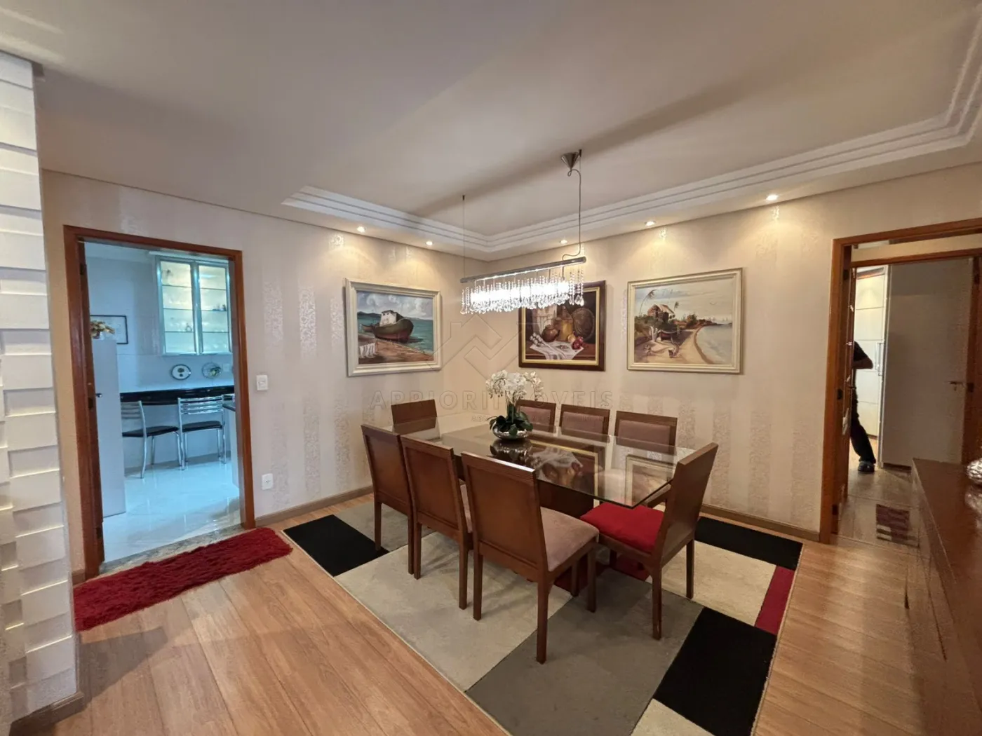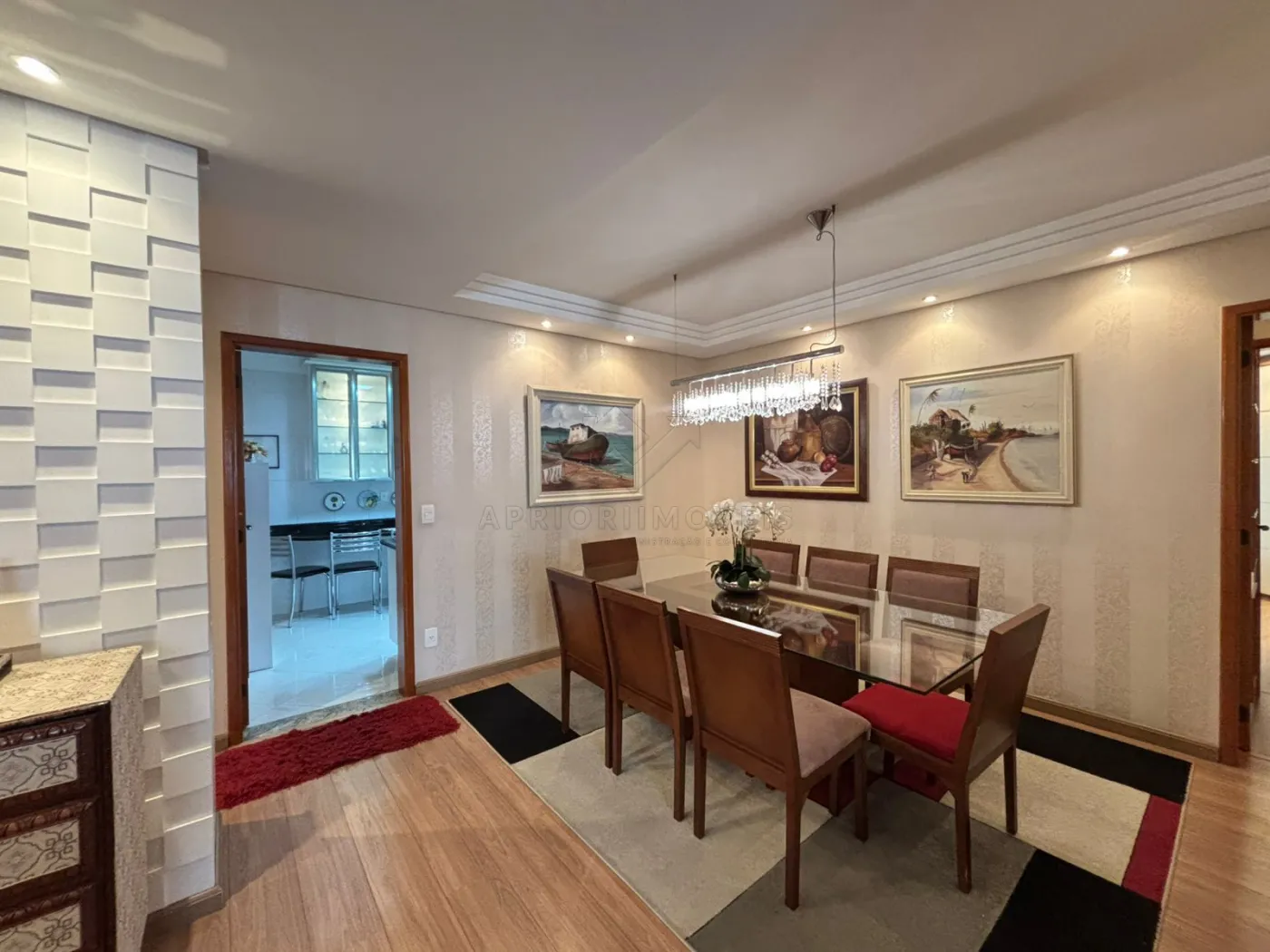 Sala de jantar com mesa em vidro e madeira (2,20m x 1,10m), 8 cadeiras, buffet em madeira, lustre e tapete.