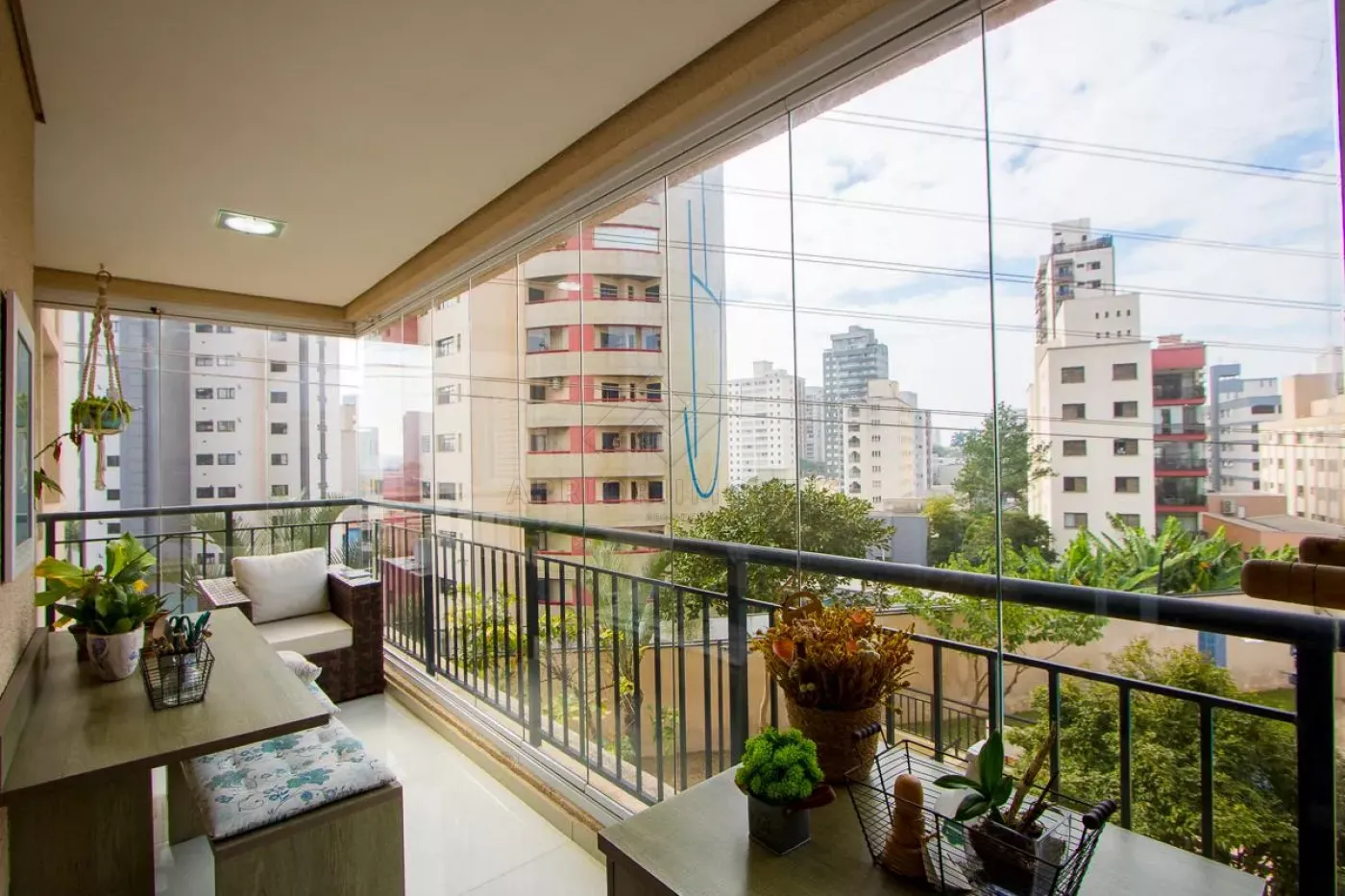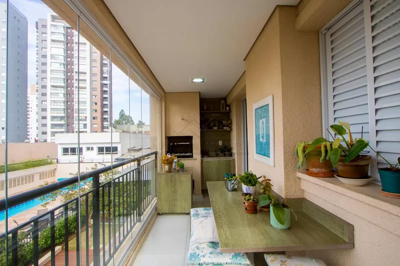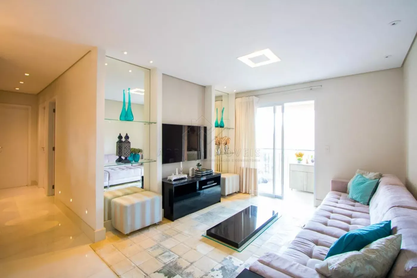 Sala com teto rebaixado e sacada gourmet com churrasqueira