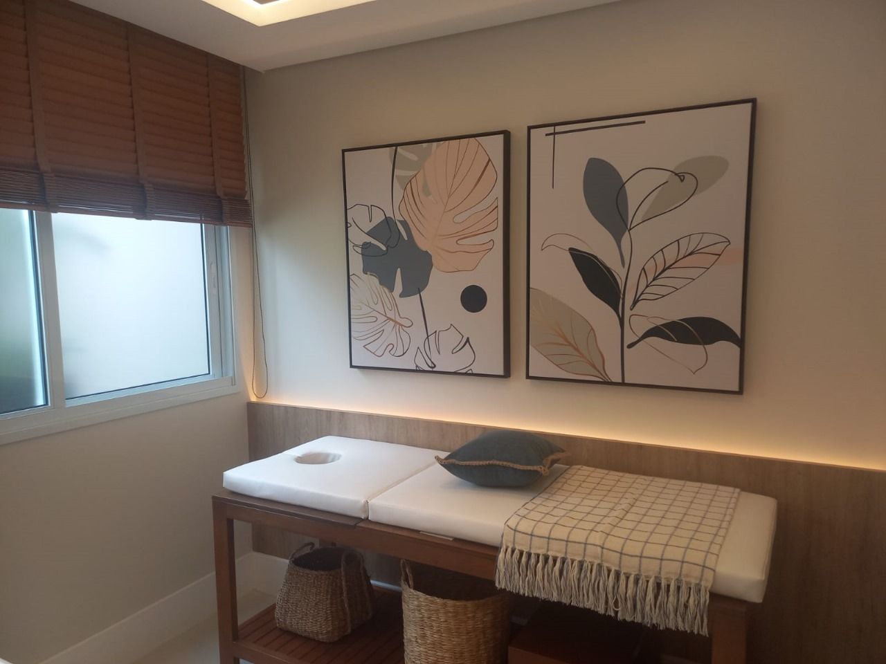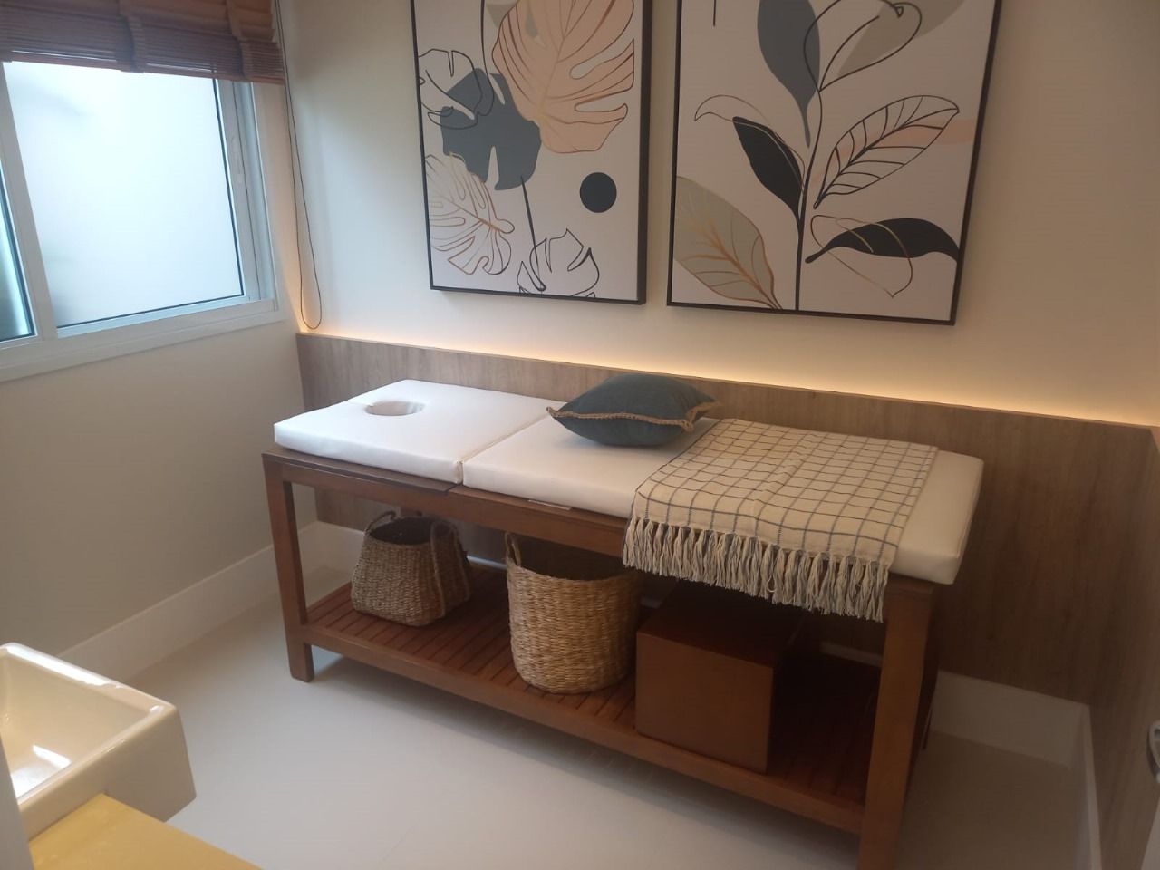 13. Sala de massagem integrada ao beauty care, com maca, bancada em granito e lavatório.
