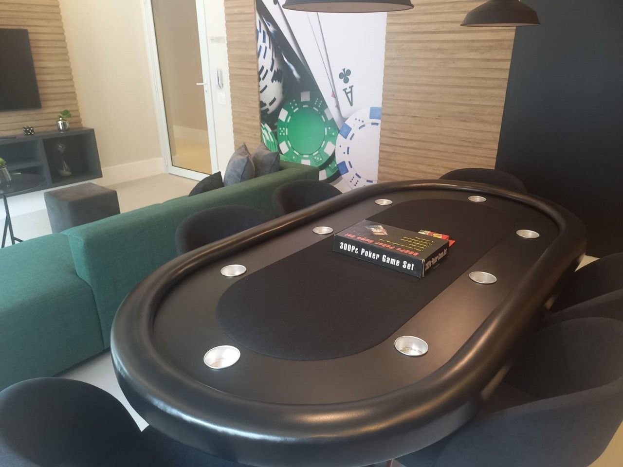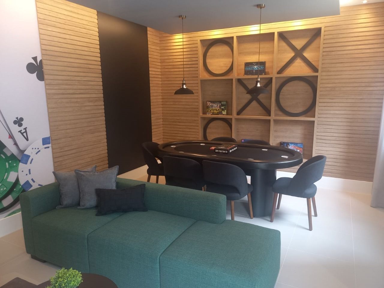 24. Salão de jogos equipado e decorado, com videogame de última geração, TV LED, mesa de pôquer, sofá e frigobar. A sala de jogos terá infraestrutura para ar-condicionado. Basta o condomínio instalar o aparelho.