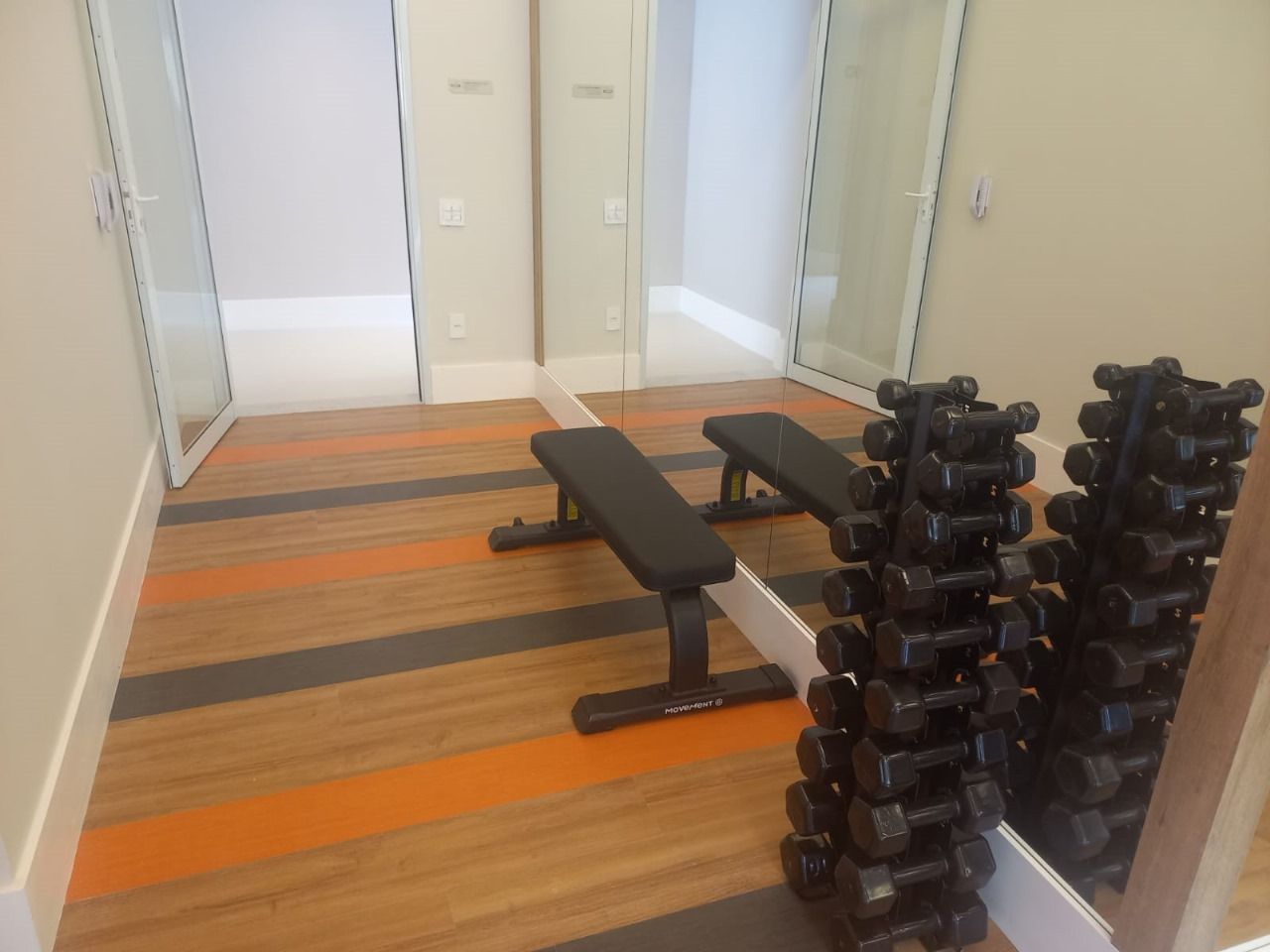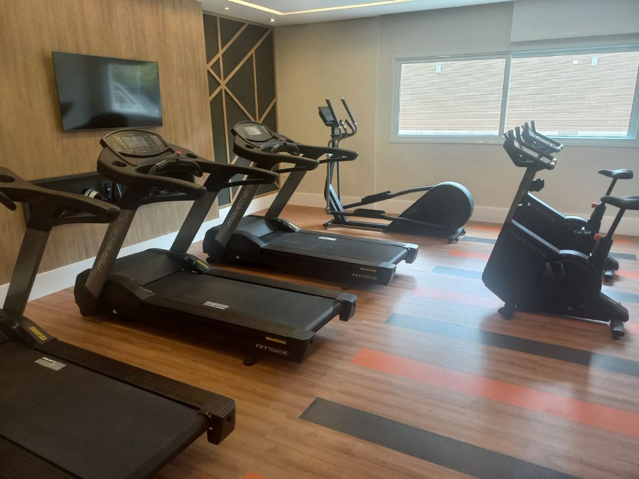 16. Fitness completo: esteiras, saco de boxe, bicicleta ergométrica, torre de halteres, estação de musculação e banco para musculação. Os equipamentos são de uso contínuo, próprios para condomínios. O fitness será entregue com infraestrutura para ar-condicionado.