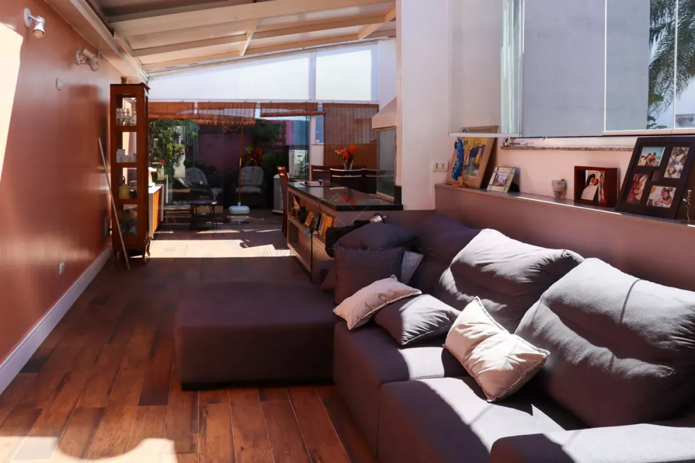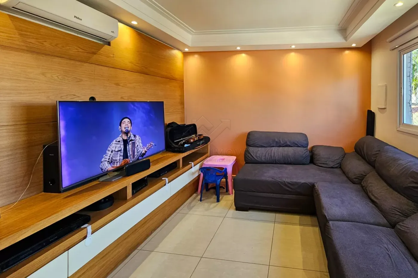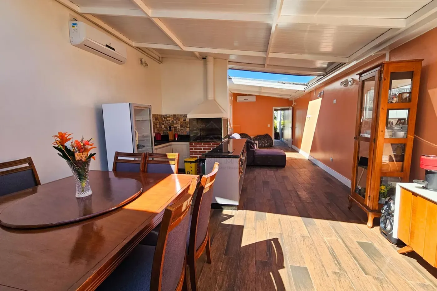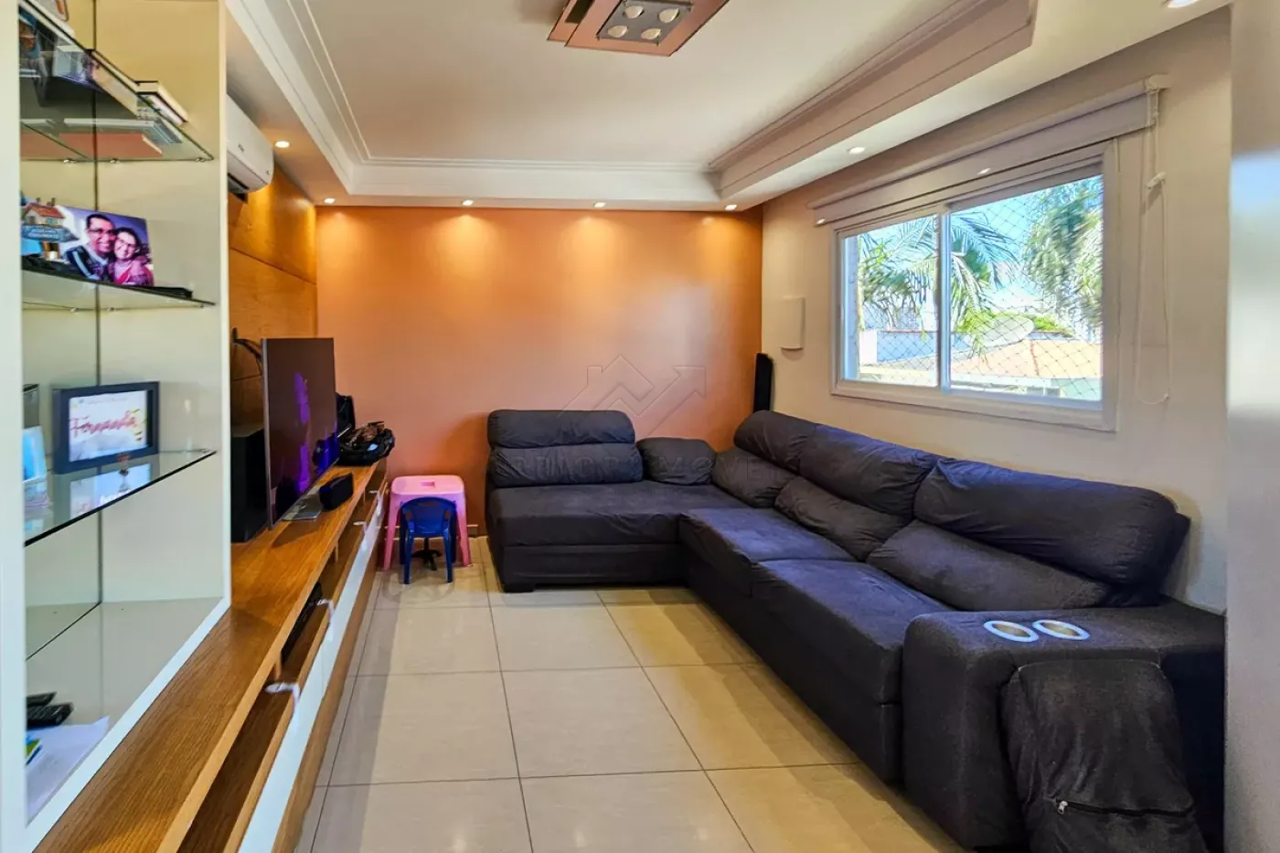 Sala ampla com teto rebaixado;
