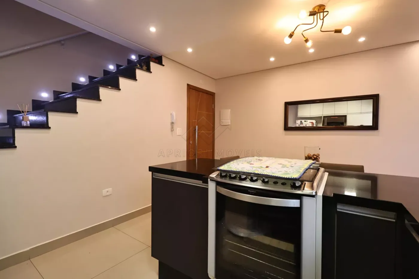 Cozinha americana com armários planejados;