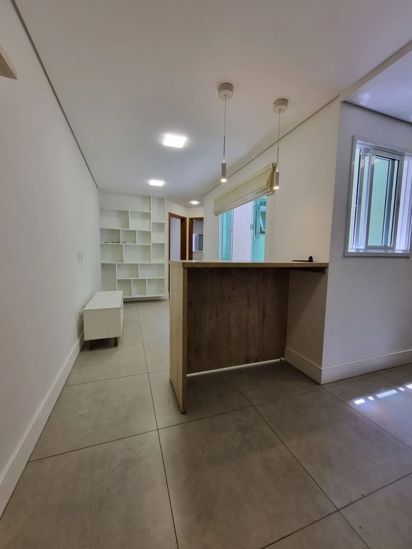 Sala dois ambientes, com painel de tv;