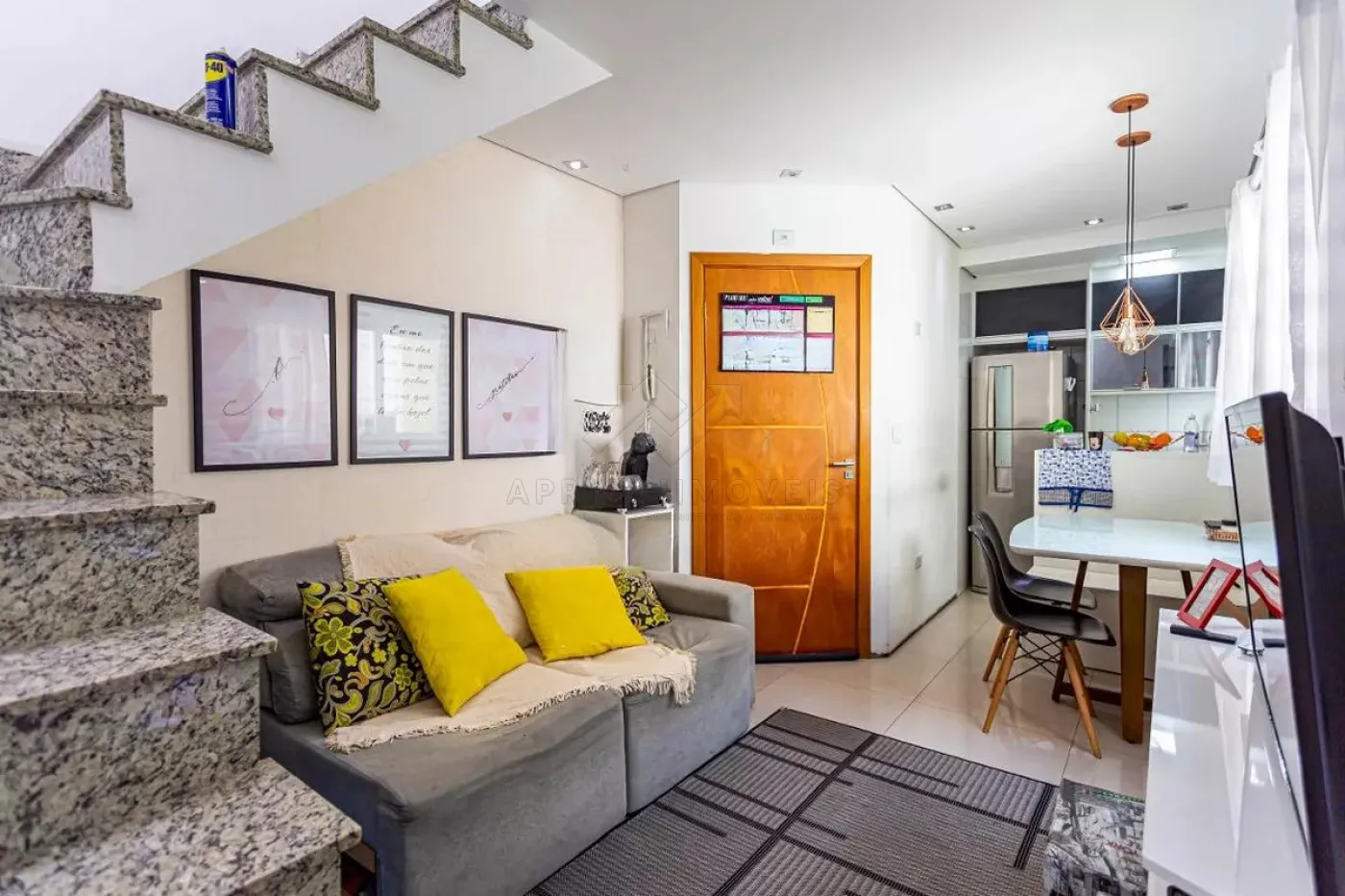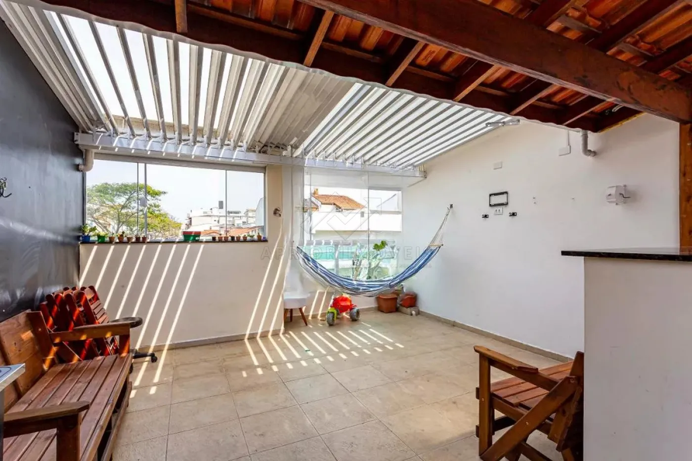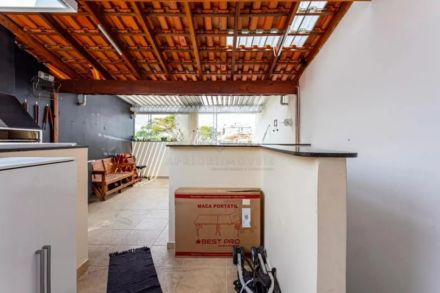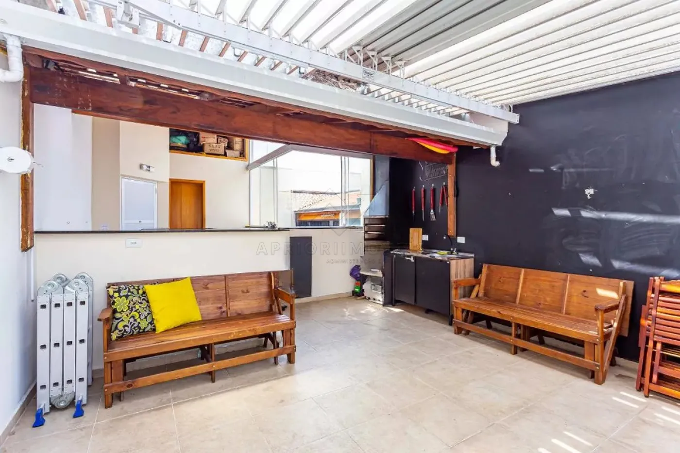 Escada interna para cobertura equipada com churrasqueira, já coberta e área de serviços.