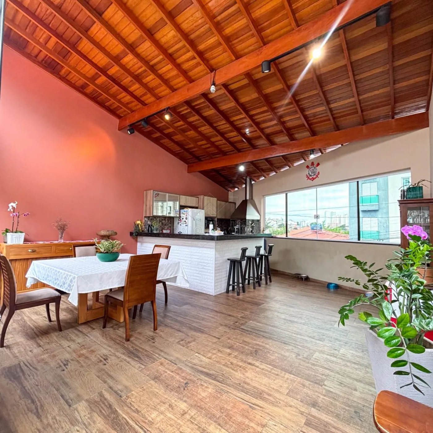 Área Gourmet ampla e coberta com Churrasqueira com espaço para mesa de jantar e banheiro