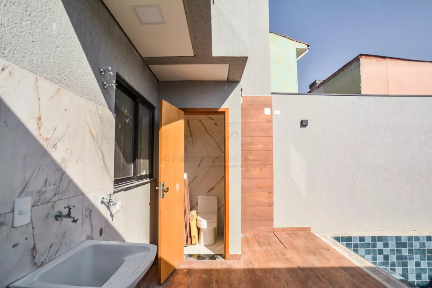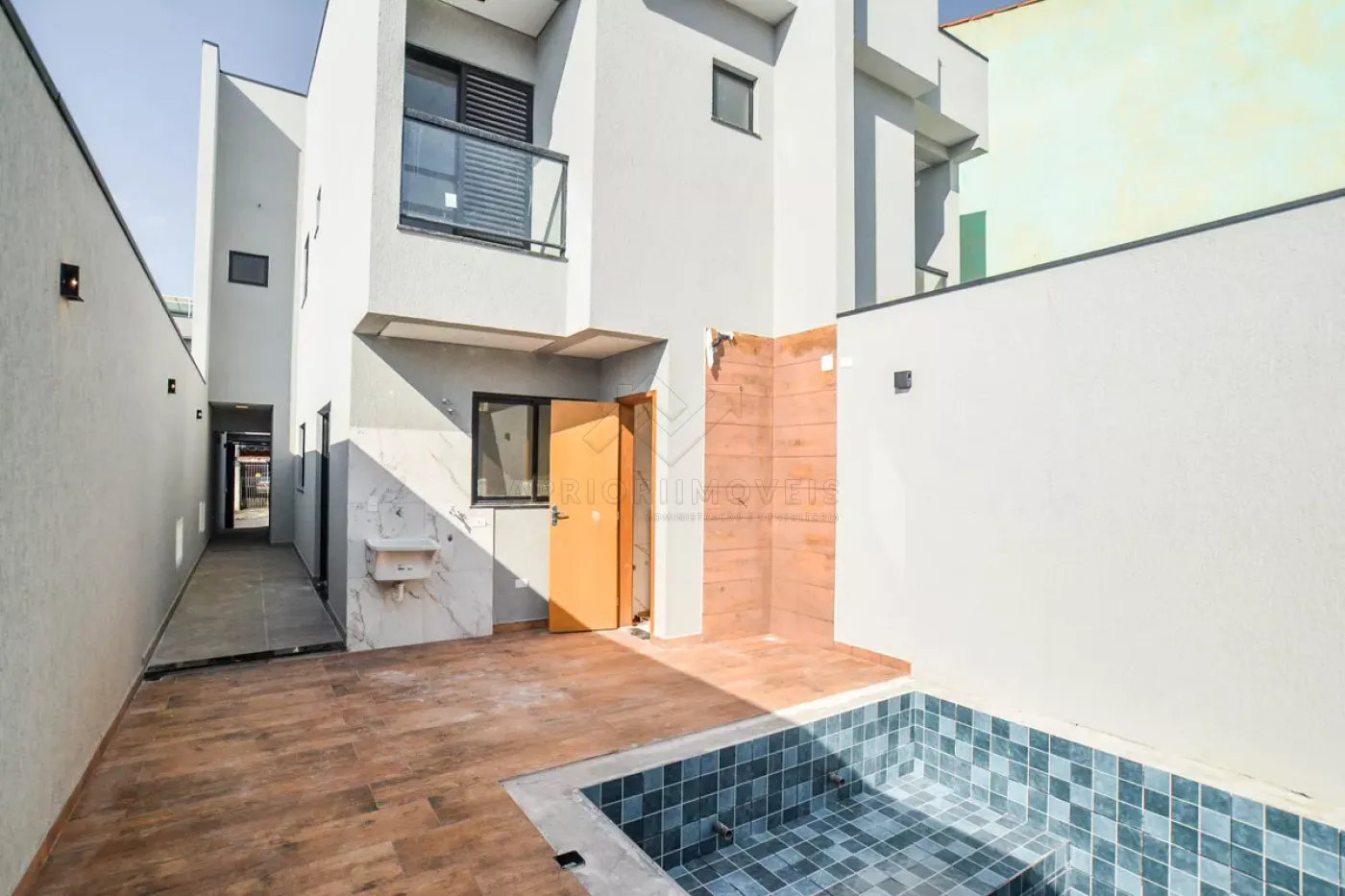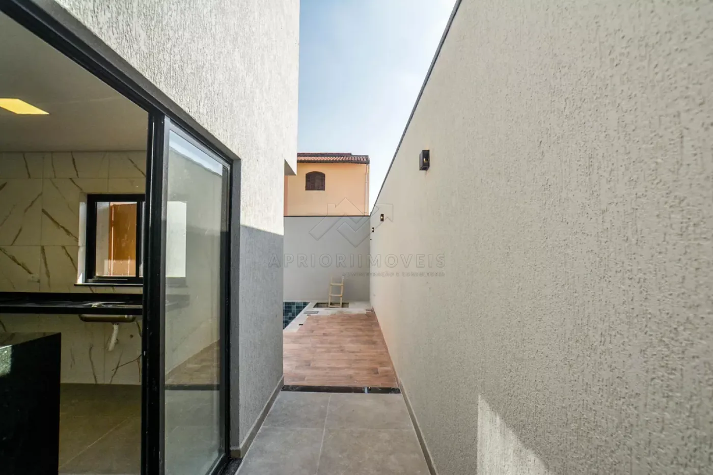 Quintal lateral com acesso para piscina nos fundos;