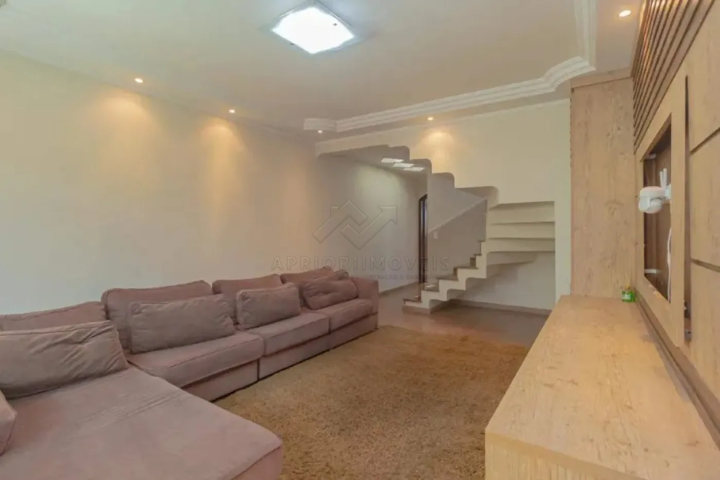 Sala de estar com acabamento em gesso e iluminação embutida
