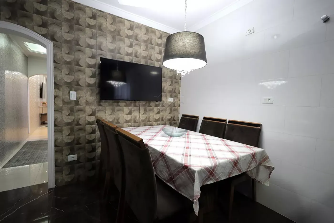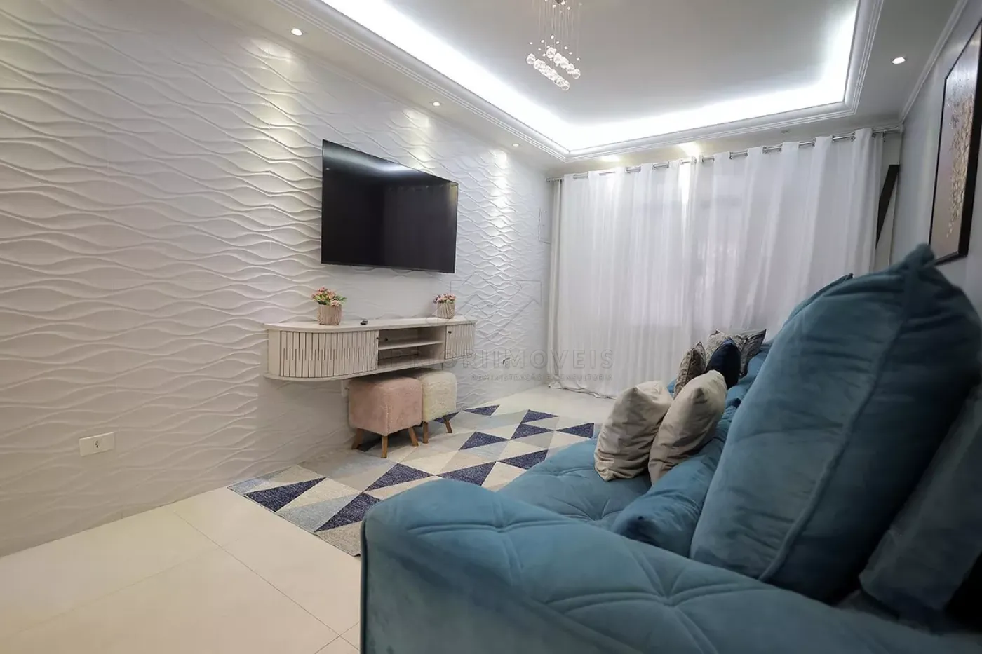 Sala dois ambientes com teto rebaixado e papel de parede;