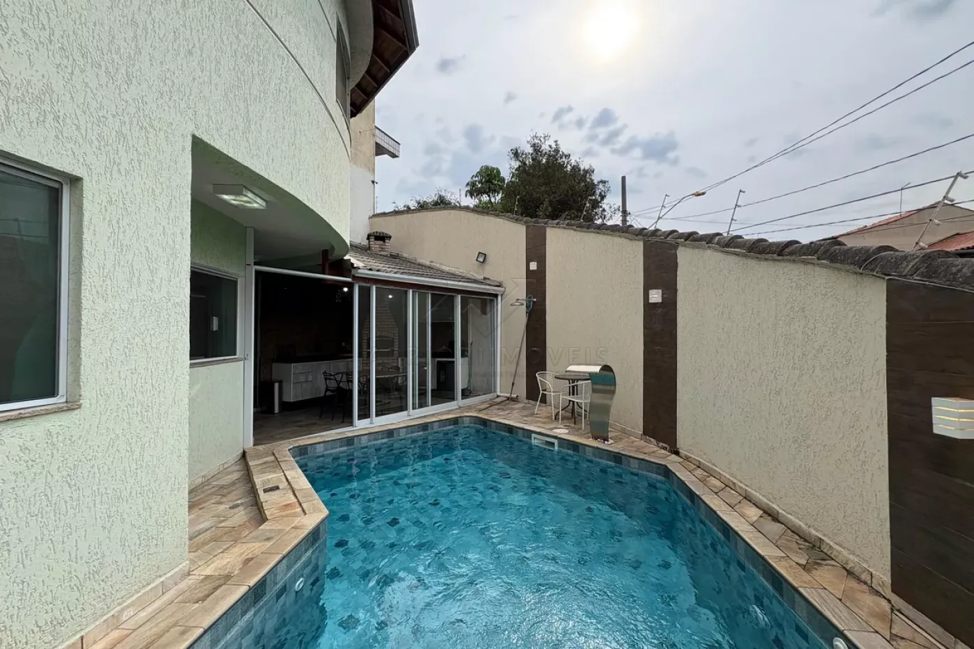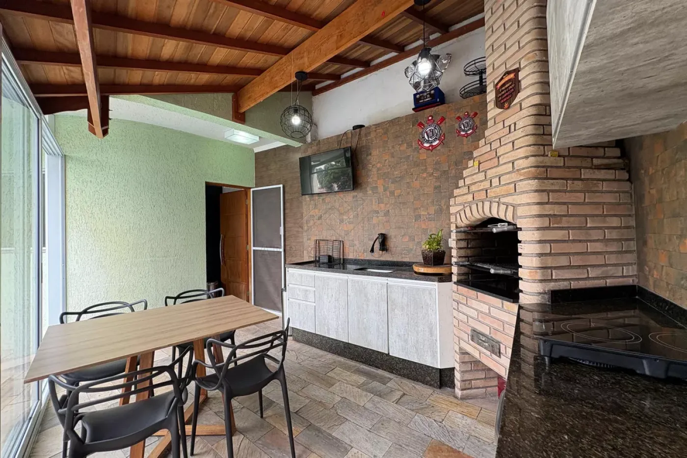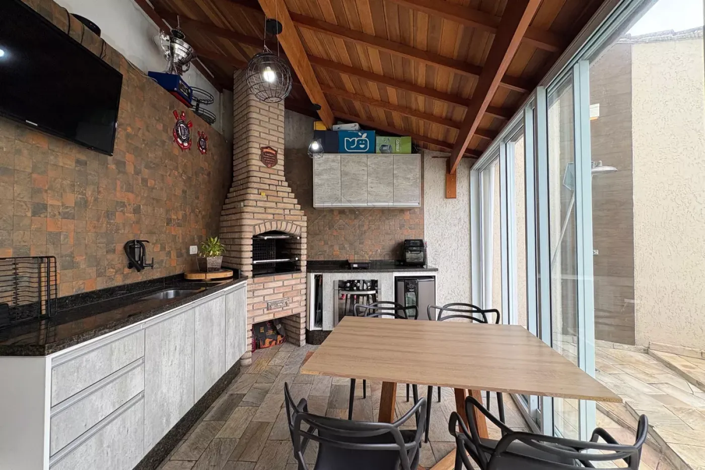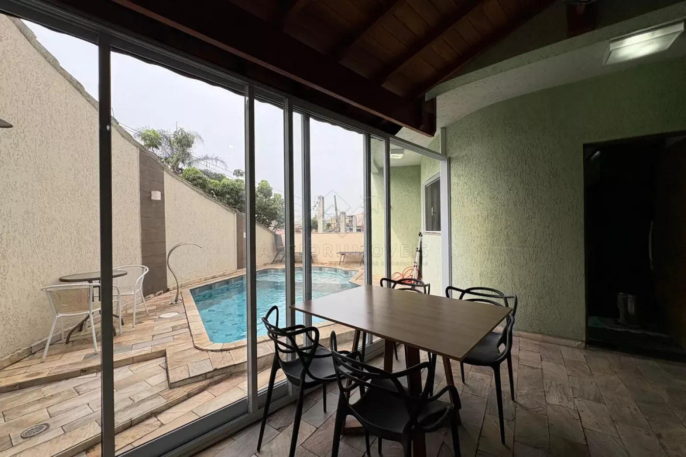 Área gourmet com churrasqueira e piscina