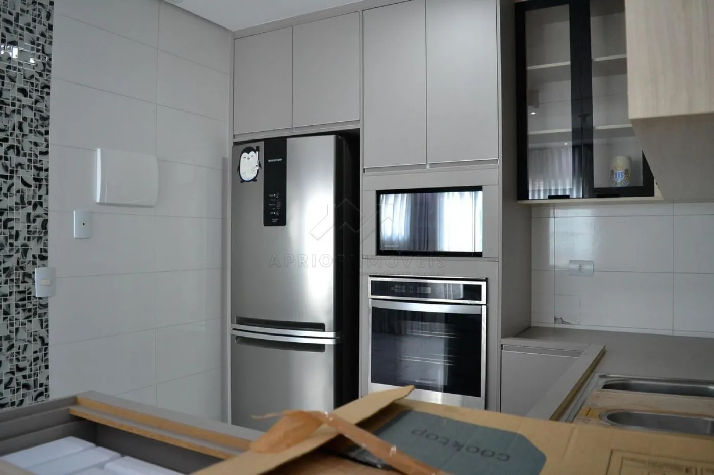 Cozinha com planejados, geladeira e forno
