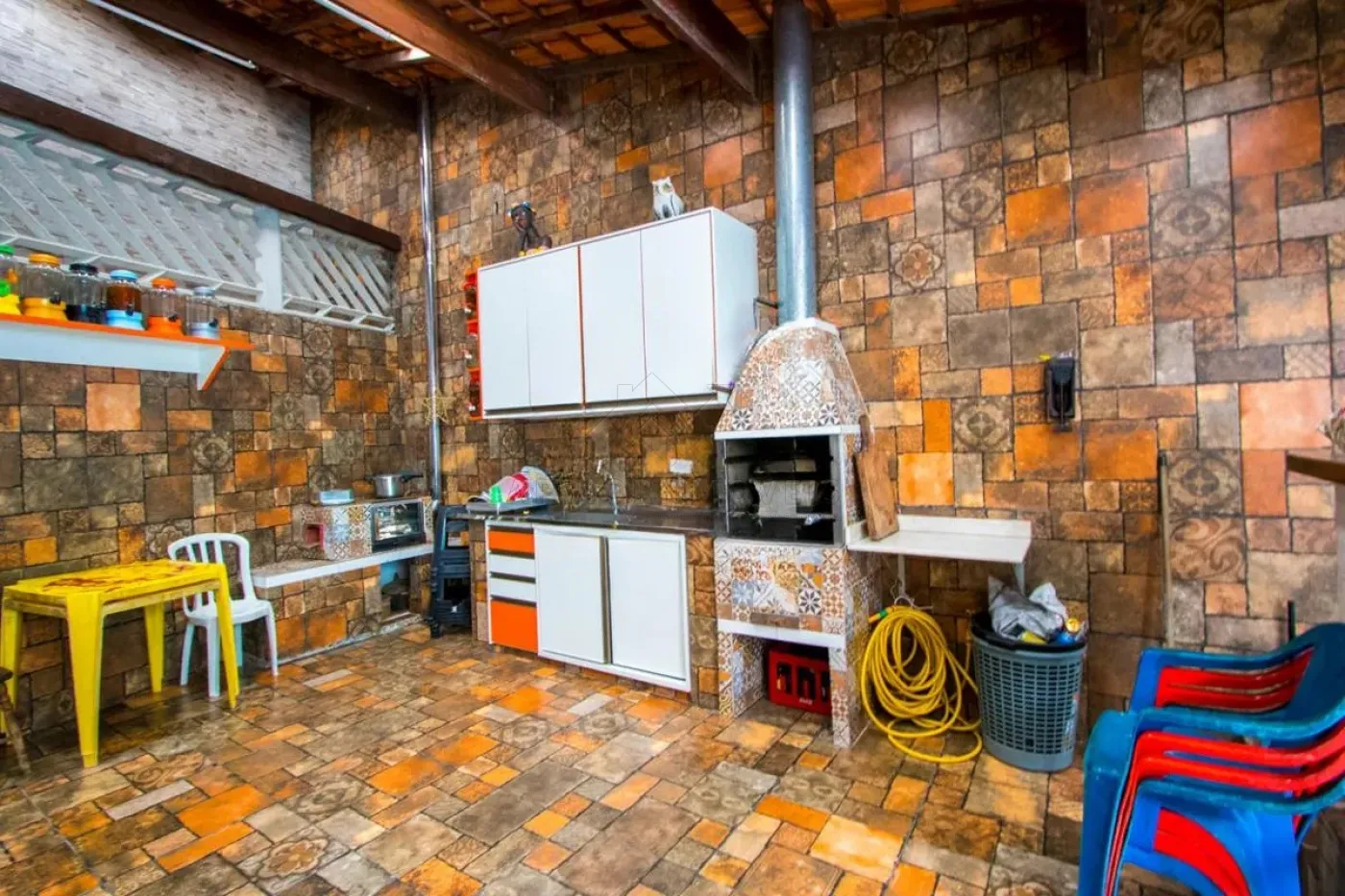 Área gourmet com churrasqueira e armários planejados;