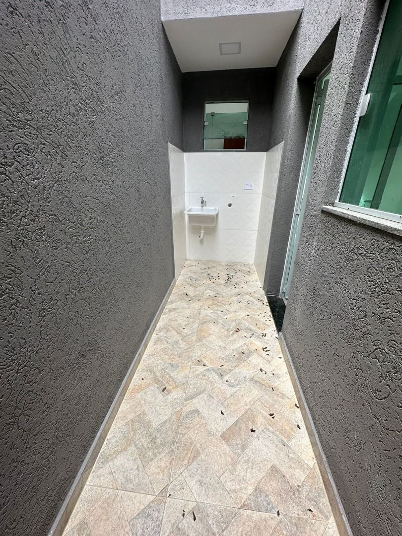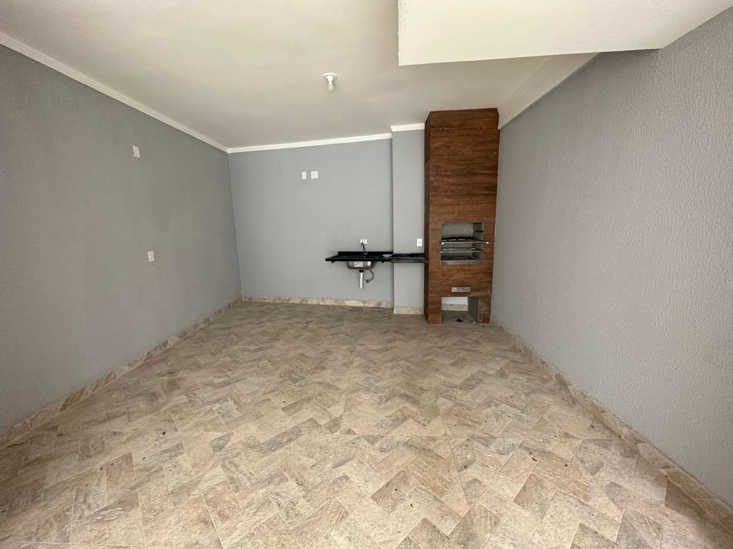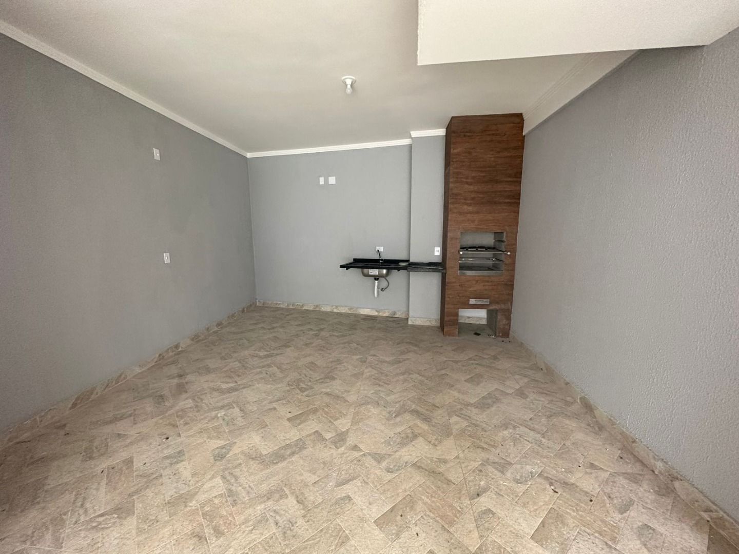 Sacada, além de espaço destinado para área gourmet com churrasqueira, pia e lavabo.