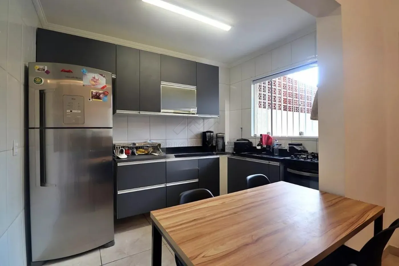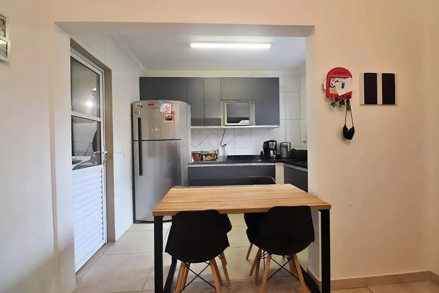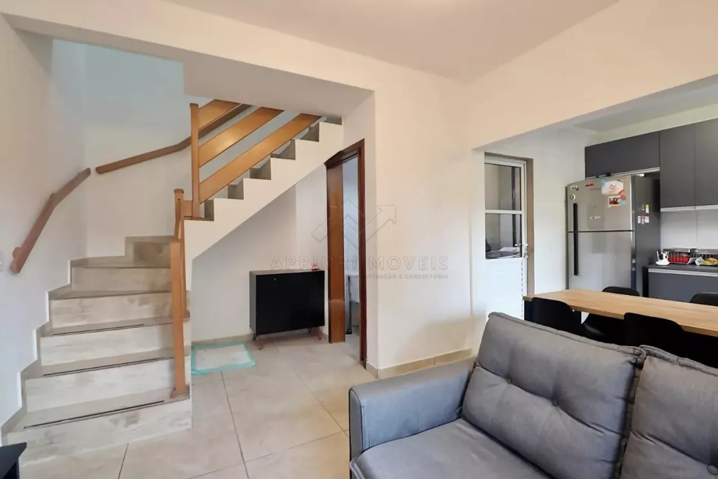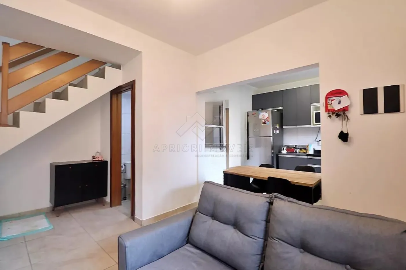 Sofá, móveis na sala, cozinha com armários embutidos, fogão, geladeira, micro ondas, mesa e 4 cadeiras.