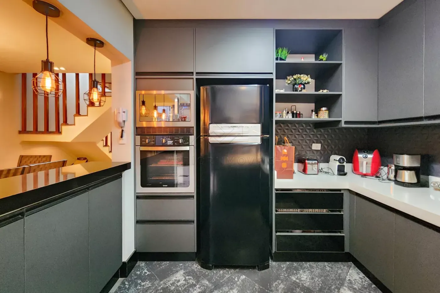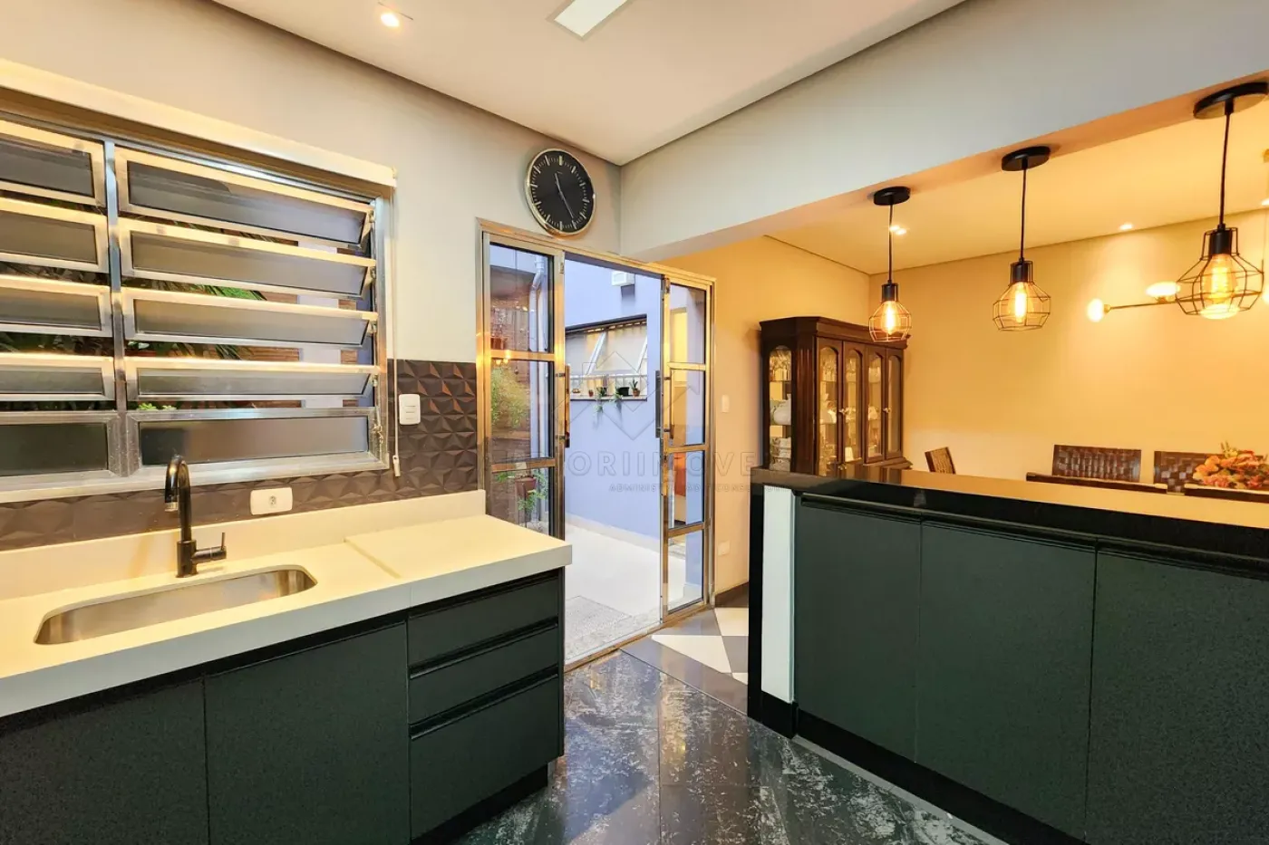 Cozinha com armários e acesso para quintal;