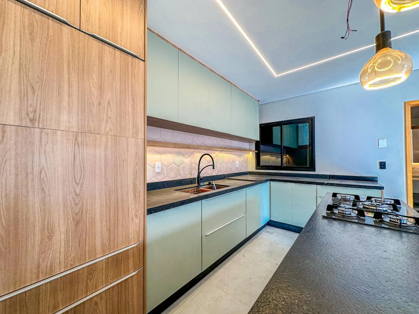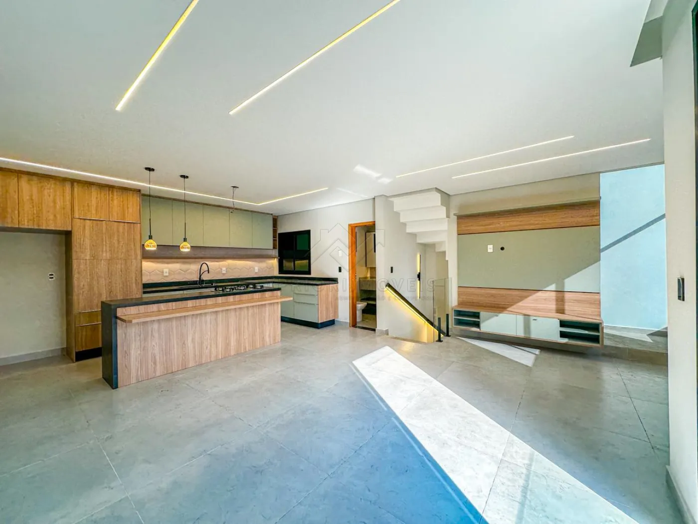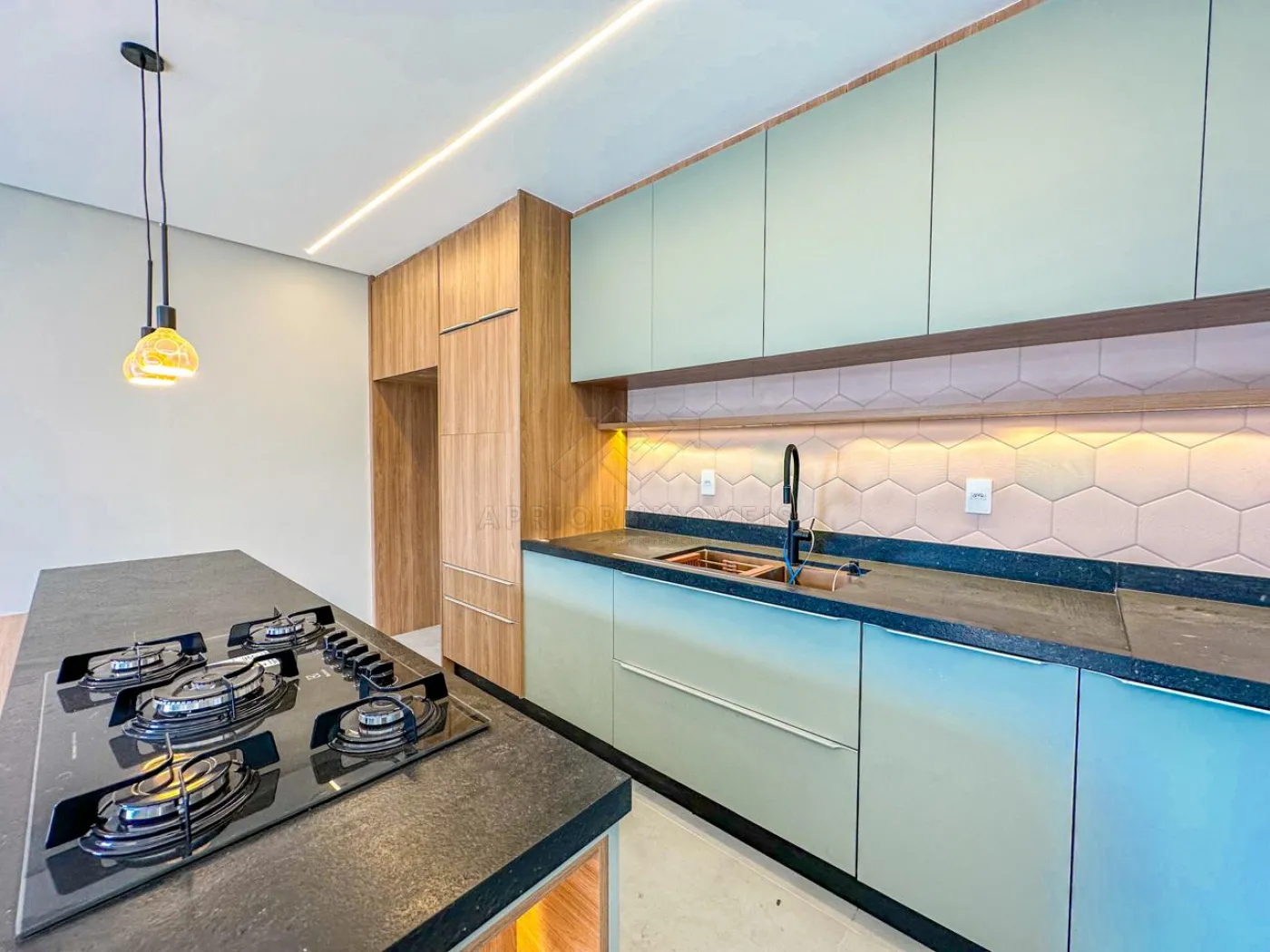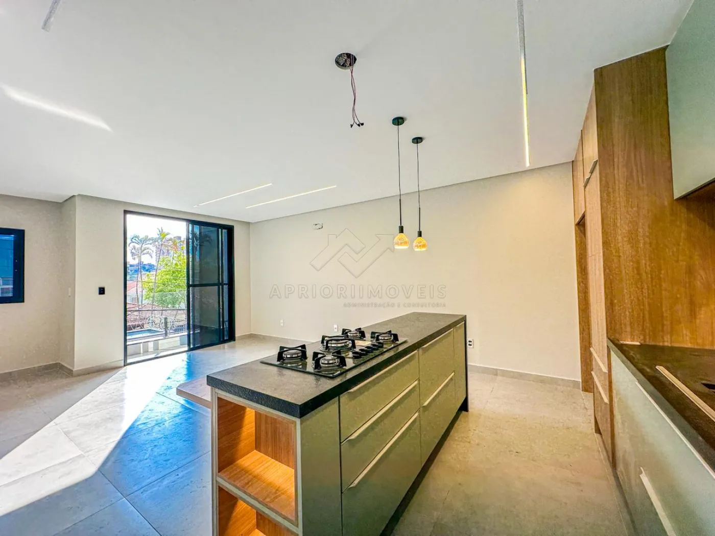 Cozinha com ilha, ambas com ambiente integrado, rica em iluminação natural e também iluminação forçada com lâmpadas e fitas de led.
