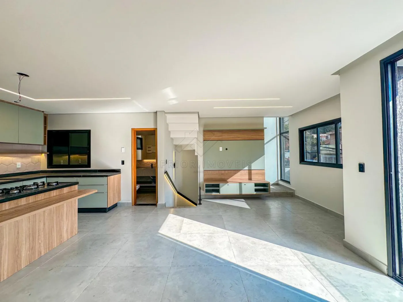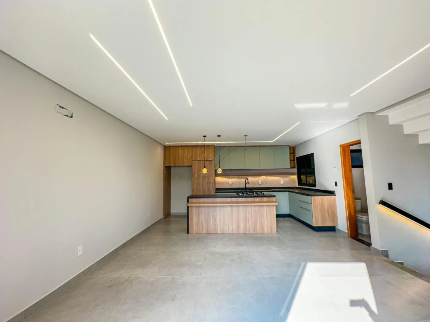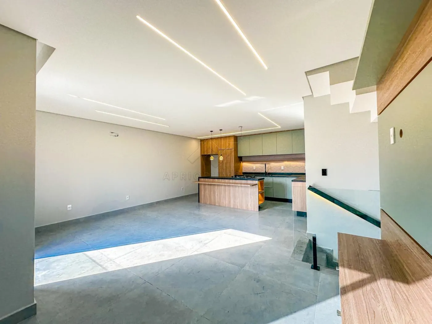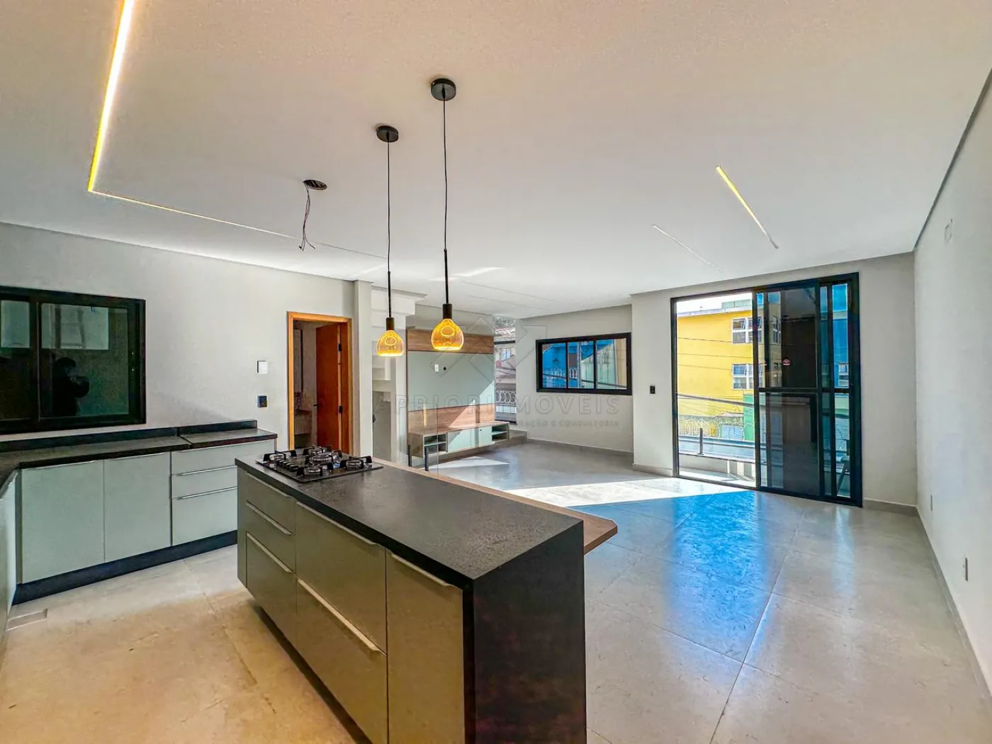 Cozinha com ilha, ambas com ambiente integrado, rica em iluminação natural e também iluminação forçada com lâmpadas e fitas de led.