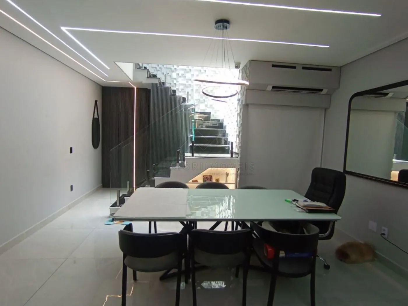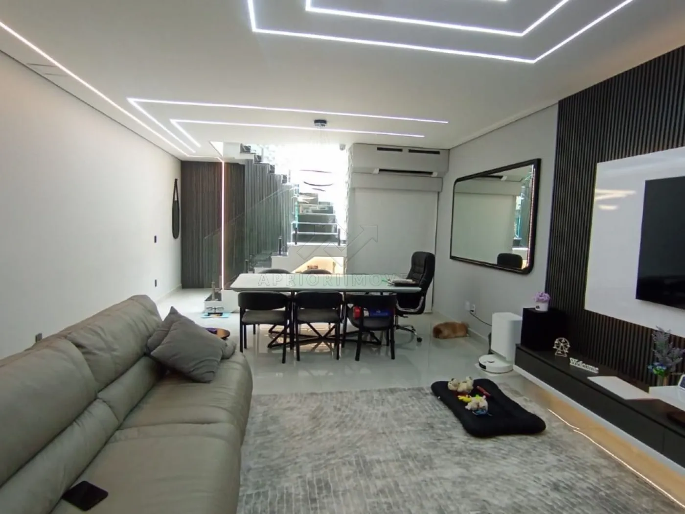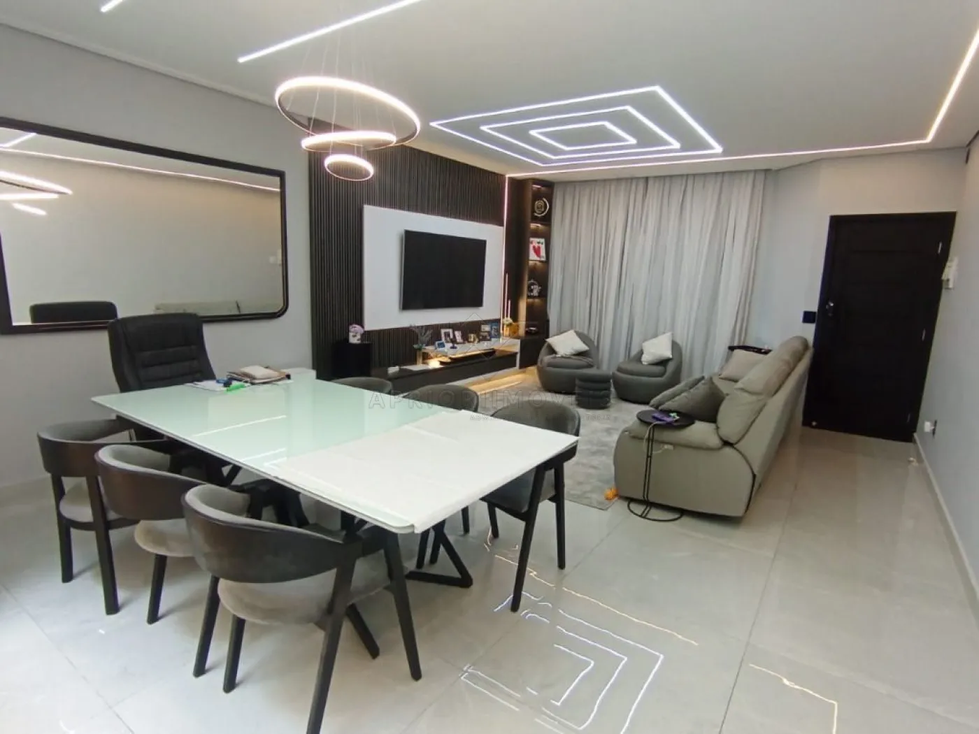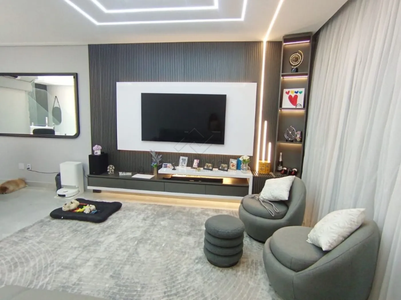 Sala ampla para dois ambientes com painel e adega;