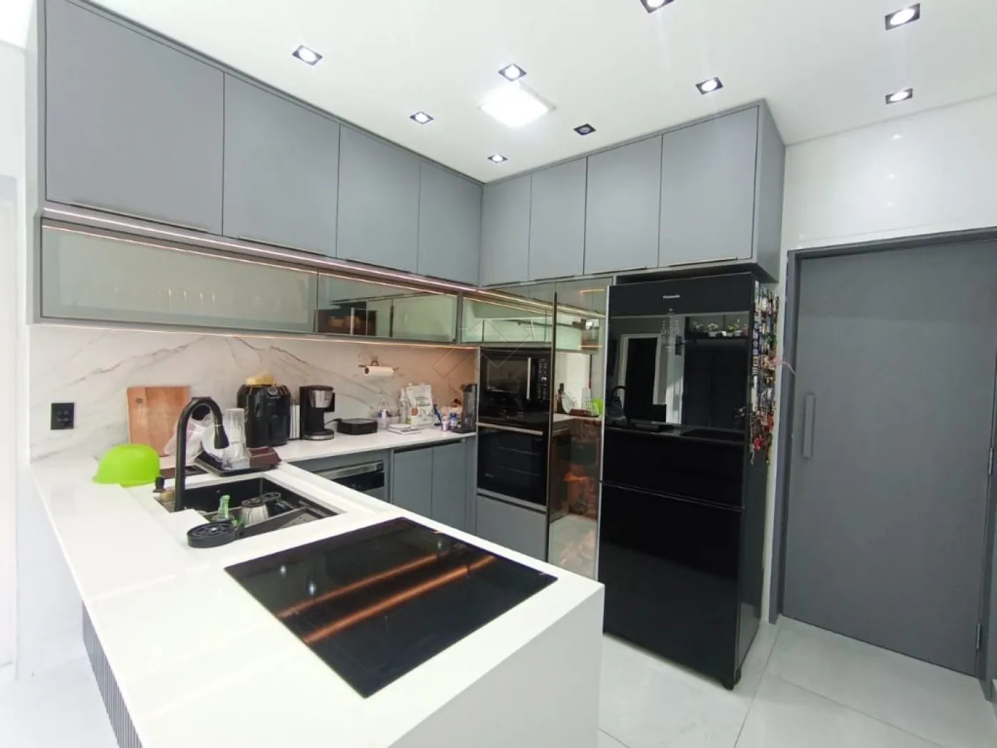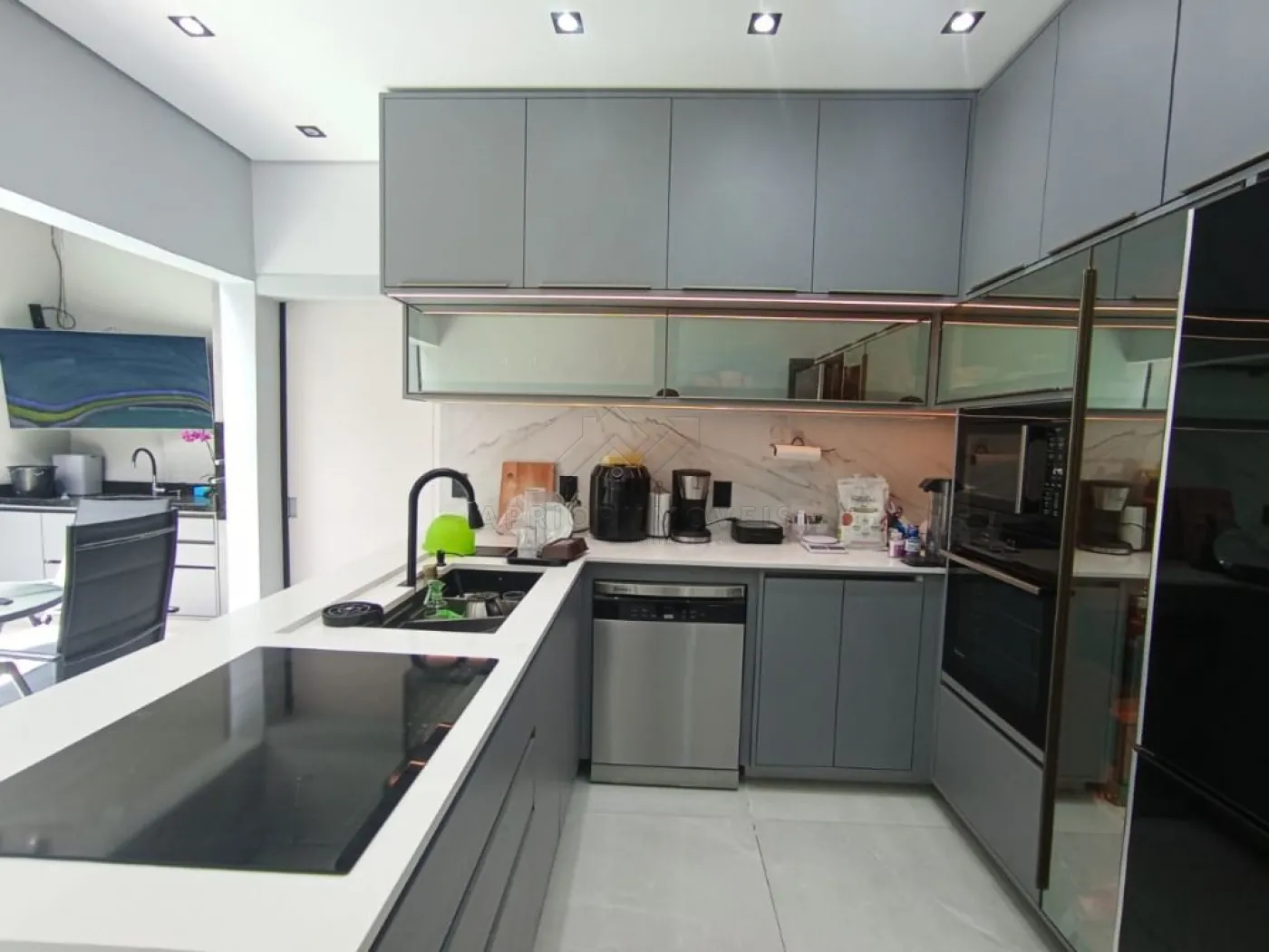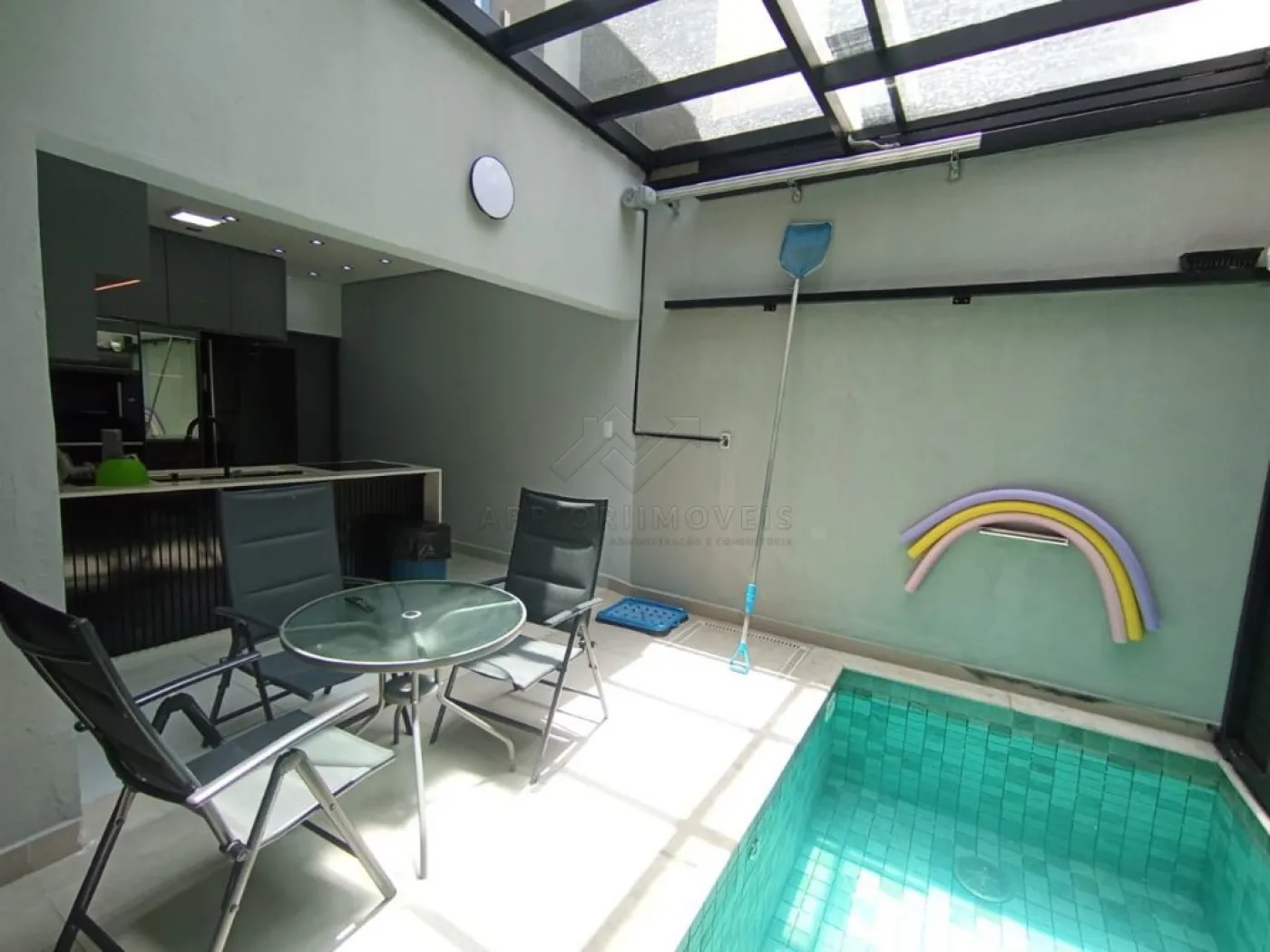 Cozinha planejada com ilha, integrada à piscina e ao espaço gourmet;