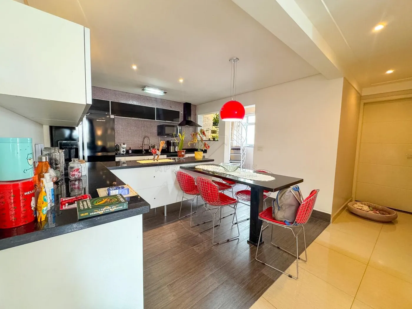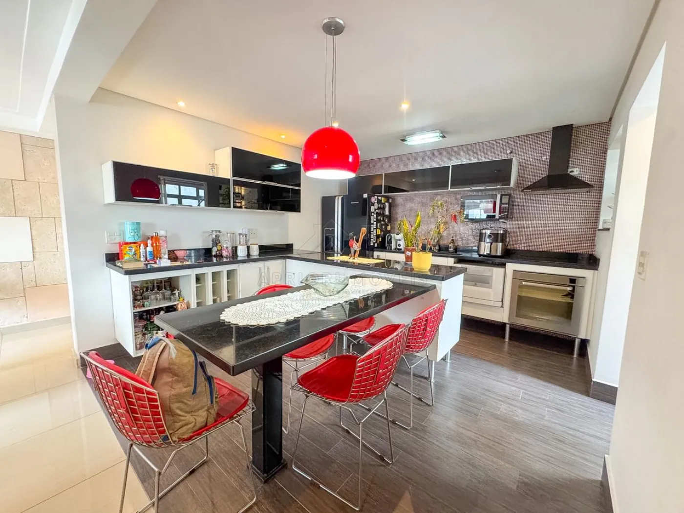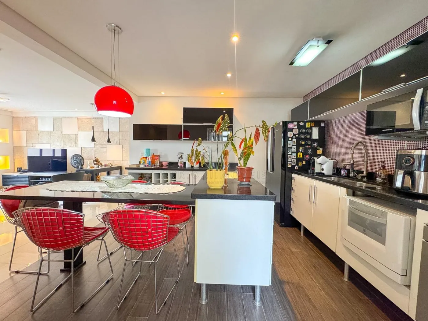 Cozinha com planejados, geladeira e coifa;